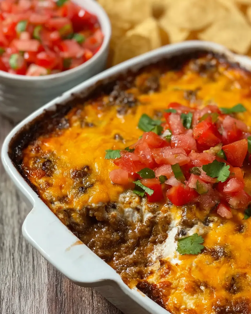 Once it’s out, let it cool for just a minute before serving. Pair it with crisp tortilla chips and watch it disappear. Enjoy your tasty baked taco dip—it’s bound to be a hit!