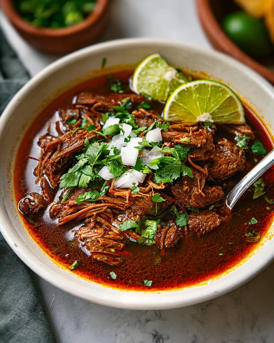 Return the shredded beef to the slow cooker and stir it into the sauce, letting it absorb the delicious liquid for a few minutes. When it's time to serve, you can either enjoy your birria straight from the slow cooker or assemble some inviting tacos. Don’t forget to garnish with chopped onion, fresh cilantro, and a squeeze of lime juice for that perfect finish.