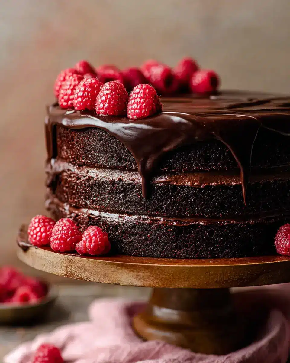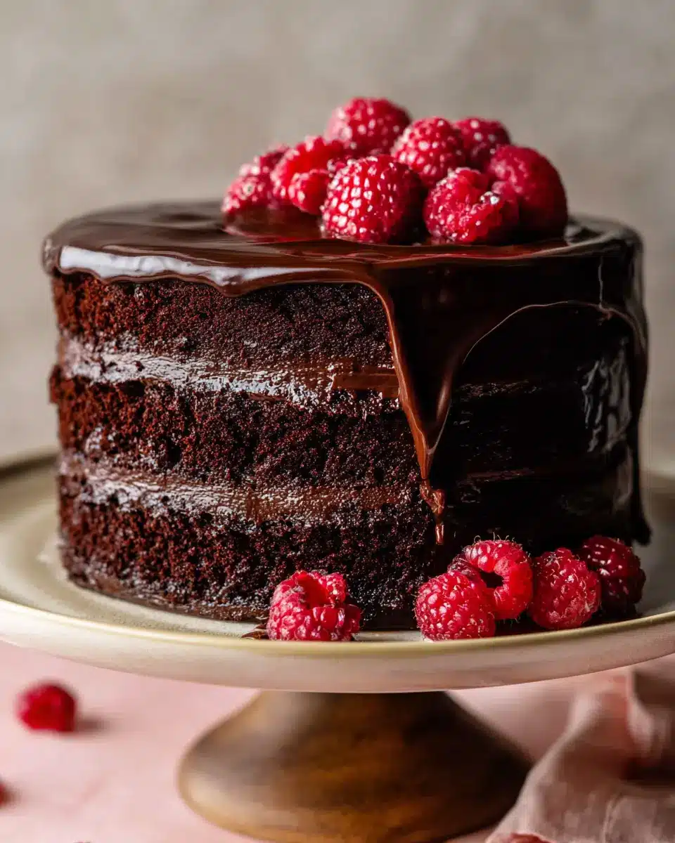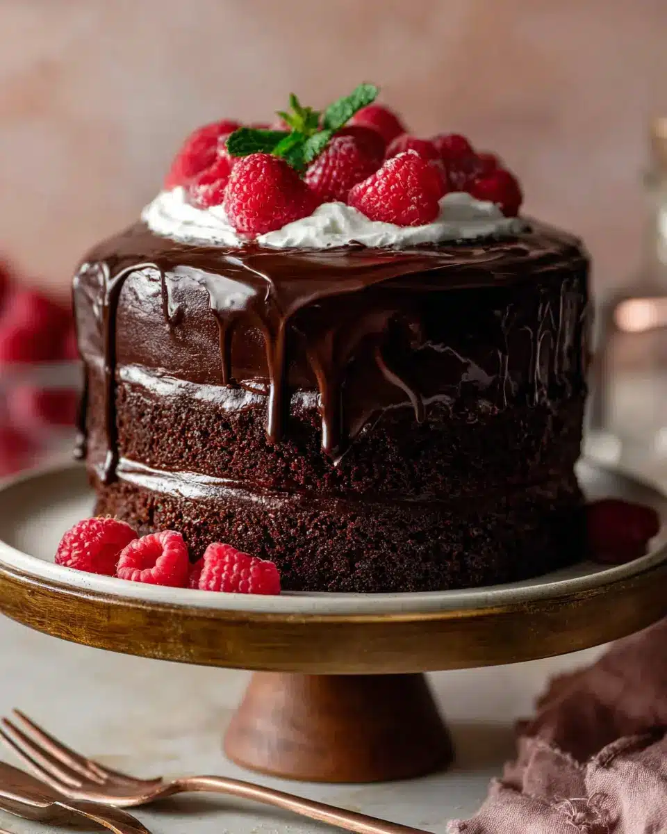 To give your Chocolate Raspberry Cake a show-stopping finish, prepare a silky chocolate ganache. Start by heating heavy cream and pouring it over finely chopped chocolate. Stir until smooth and glossy. Let it cool and thicken for about 30 minutes, then pour it over the assembled cake, letting it drip down the sides. Optional: Garnish with fresh raspberries for that charming final touch.