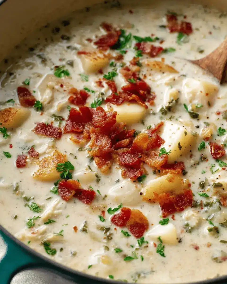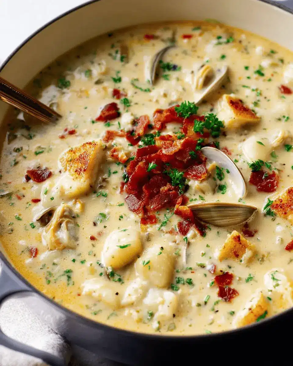 Finally, it’s time to add the star of the show: the clams! Stir in three cans of chopped clams, reserving the juices, and let them heat through for about five minutes. Don’t forget to remove that bay leaf before serving. Ladle your chowder into bowls and garnish with freshly cracked pepper and chopped parsley, along with a sprinkle of crispy turkey bacon on top for that extra crunch. Enjoy the comforting warmth of this chowder recipe—perfect for any gathering or cozy night in!