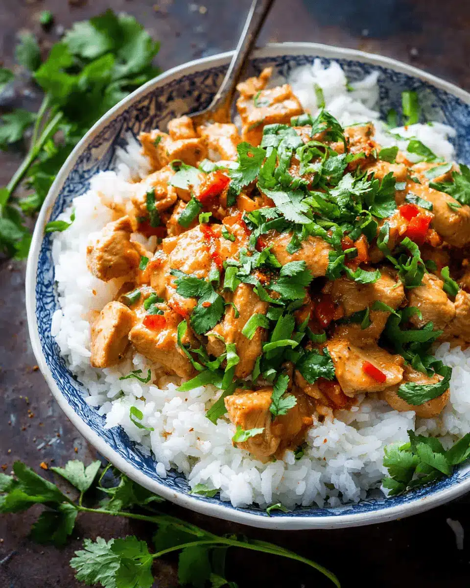 Now comes the best part—serving your Coconut Chicken Rice Bowl! Spoon 3 cups of cooked jasmine or basmati rice into bowls and ladle the coconut chicken on top. Don't forget to garnish with fresh cilantro and maybe a drizzle of extra coconut milk for a creamy finish.