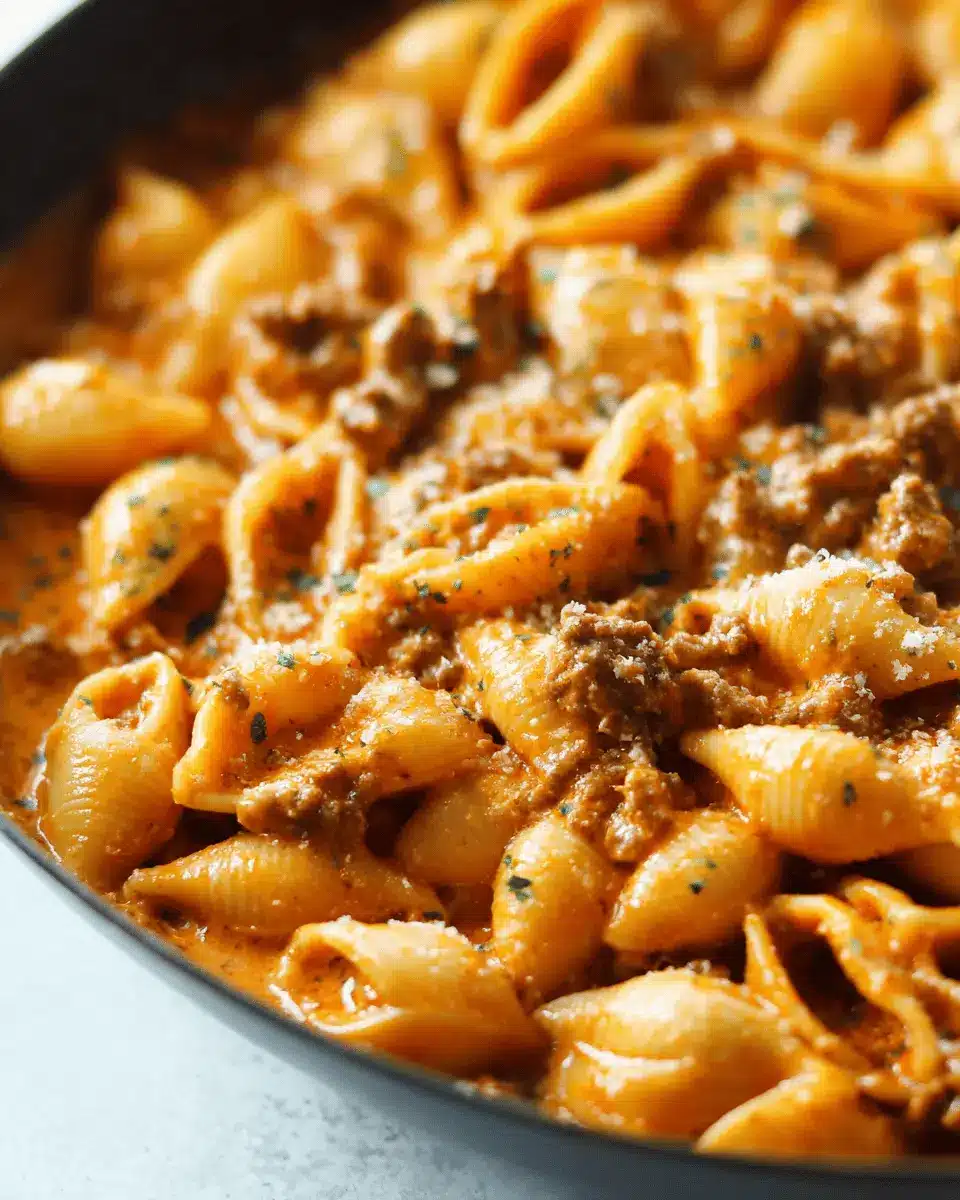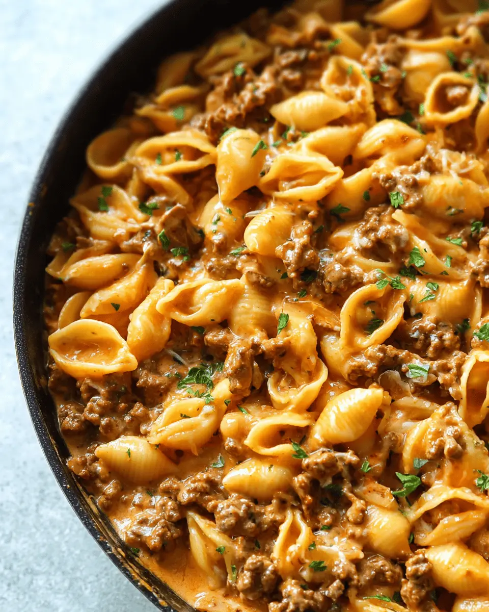 Presentation is key! Serve the creamy beef and shells in a shallow bowl, garnishing it with freshly chopped parsley or extra shredded cheddar for a pop of color. A sprinkle of freshly cracked black pepper adds a touch of sophistication. Don’t forget to serve with a side of crusty bread on a wooden board for a rustic touch that impresses your guests and gives a cozy home-cooked feel.