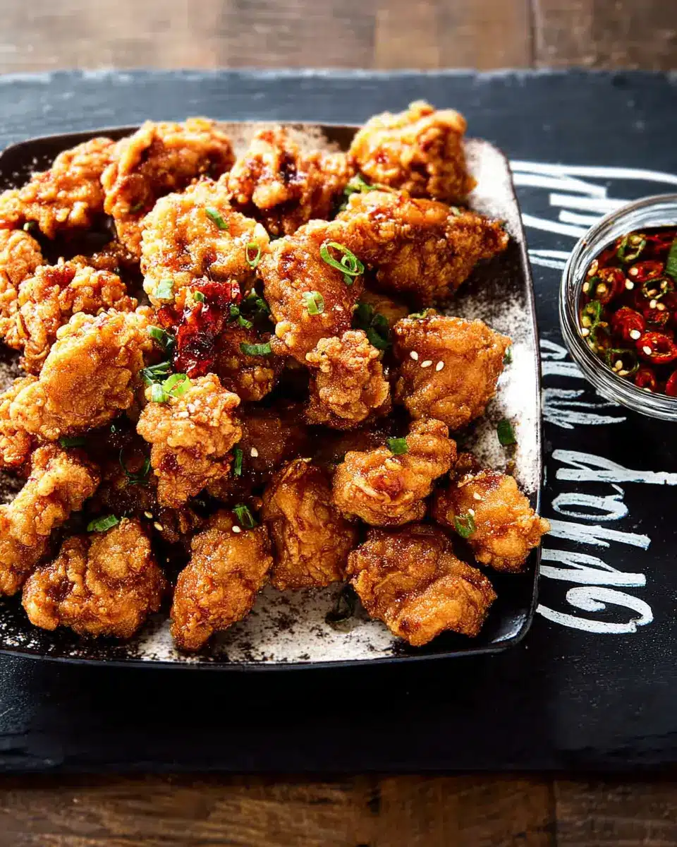 If you crave a little heat, consider upgrading your Dakgangjeong Soy Garlic Fried Chicken by adding gochugaru (Korean red pepper flakes) or sliced fresh chilies to the marinade. This fiery twist not only intensifies the flavor but also brings a vibrant kick. For those who love a customized spice level, start with a small amount and adjust it to your liking. A drizzle of spicy sesame oil right before serving can also enhance that flavor profile and give your dish an exciting finish.