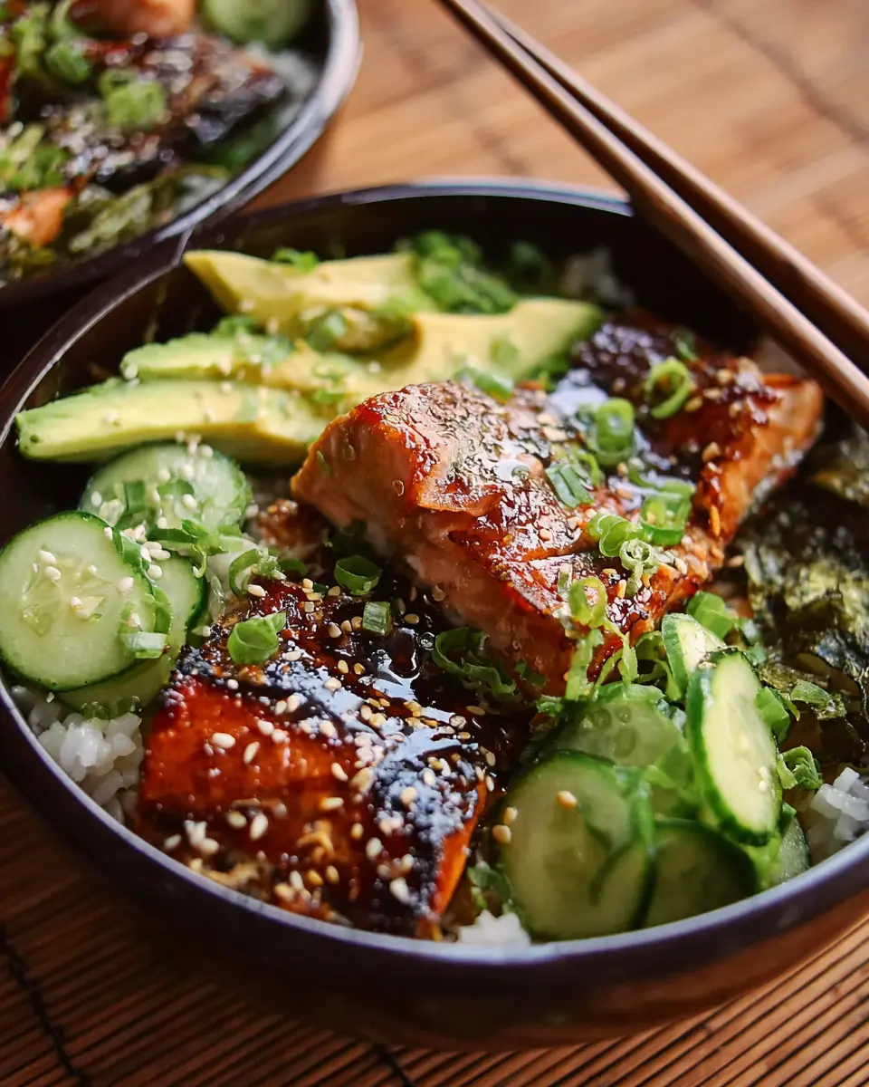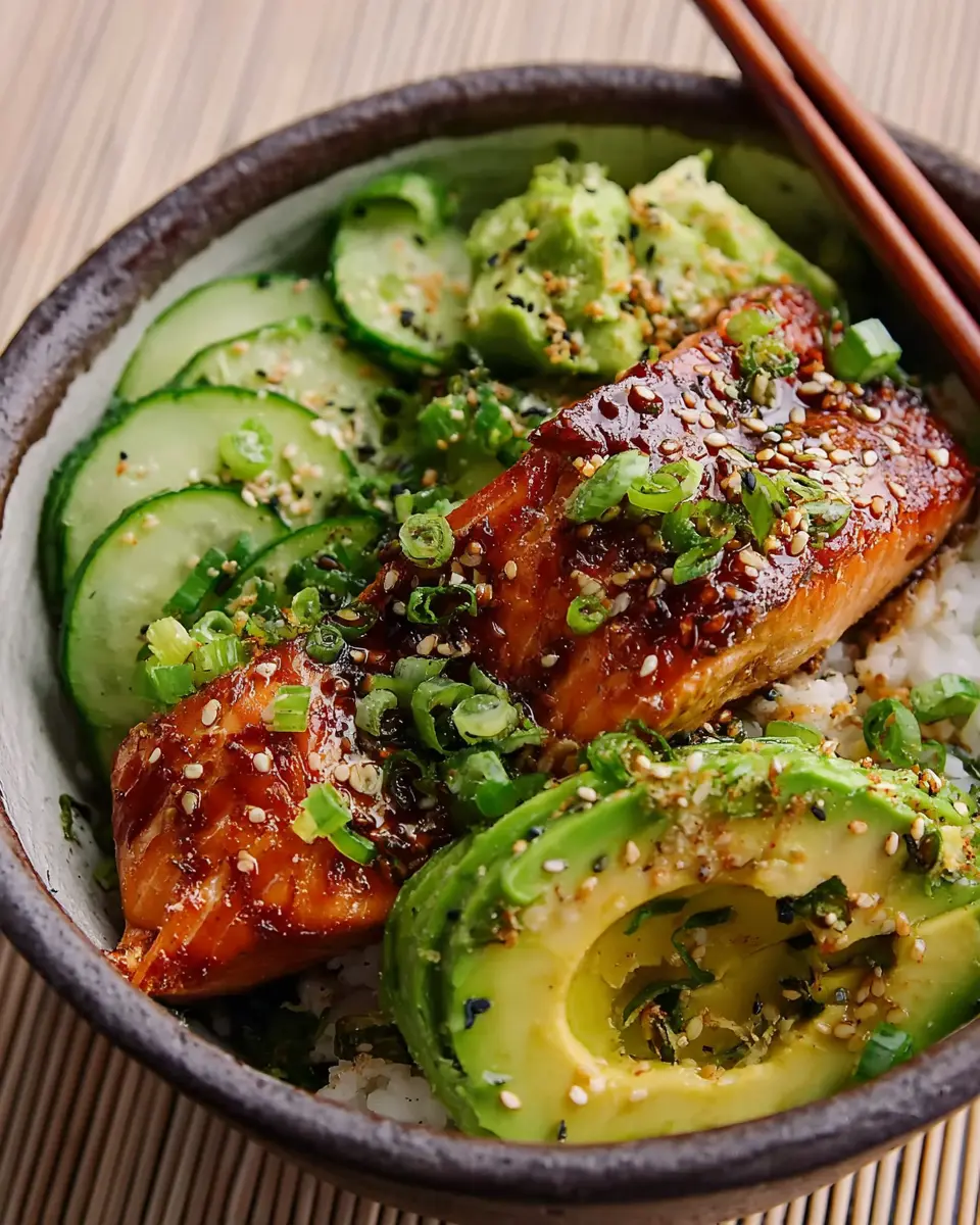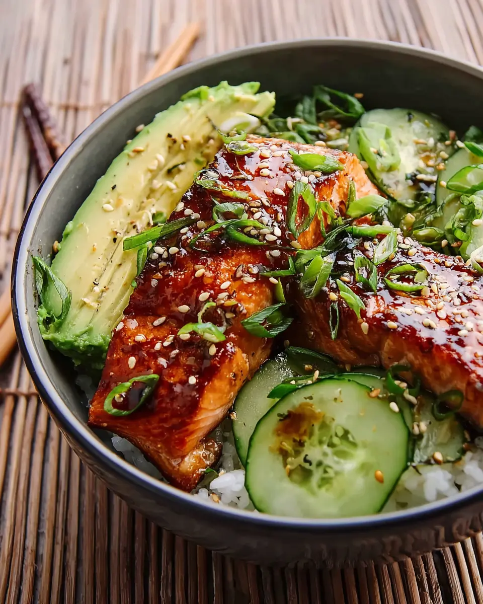 Easy Teriyaki-Glazed Salmon, Cucumber, and Avocado Rice Bowls Recipe