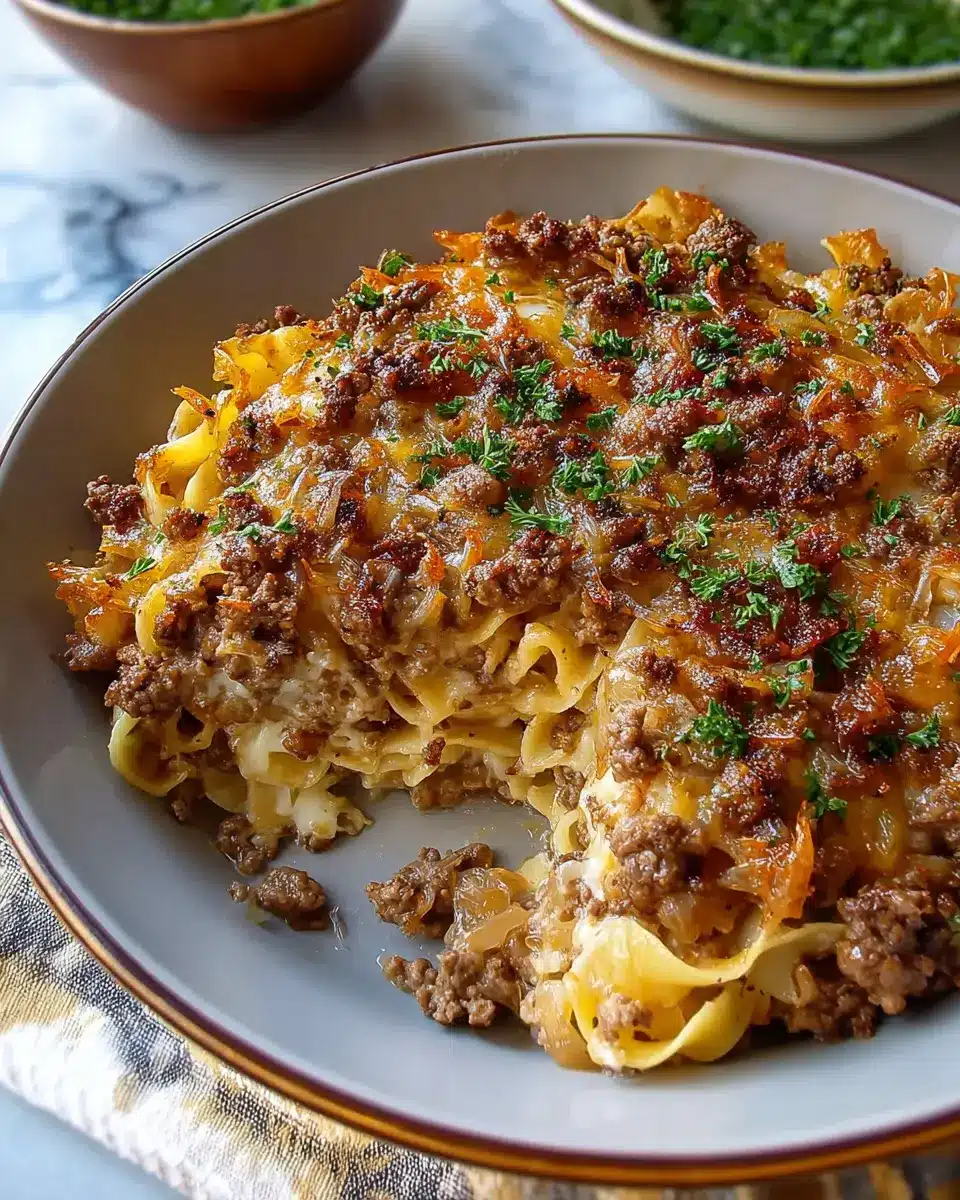 Presenting your Family French Onion Hamburger Casserole can enhance its appeal at the dinner table. Consider serving it straight from the skillet for a rustic touch, or transferring it to a colorful serving dish to catch the eye. Garnish with fresh herbs like parsley or chives to add a pop of color and freshness. Don’t forget to provide serving spoons for easy portions, and perhaps even individual bowls for a more personal feel—perfect for cozy family dinners!
