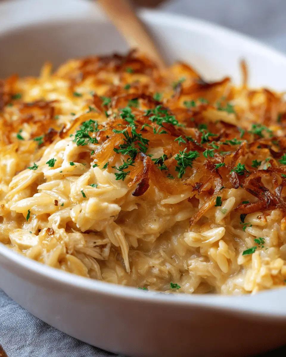 French Onion Chicken Orzo Casserole