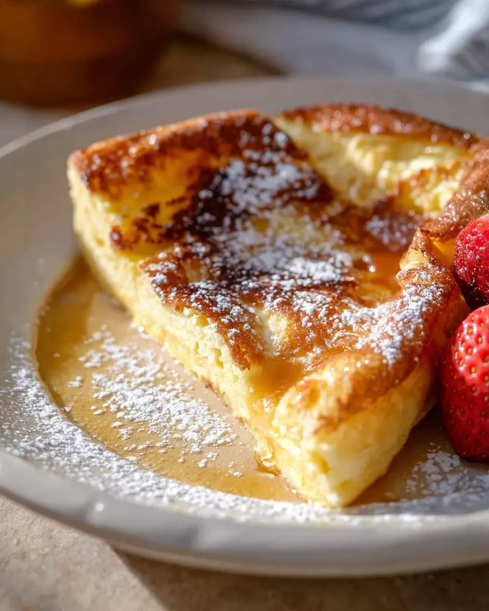 When your German Pancakes are finished baking, take them out of the oven (remember, hot dish!) and let them cool for a minute. The puddle of melted butter that forms will infuse your pancakes with rich flavor. To serve, sprinkle generously with powdered sugar and drizzle with your favorite syrup. You can also personalize your pancakes by topping them with fresh fruit, yogurt, or even a sprinkle of nuts—whatever indulgent combination speaks to you!
