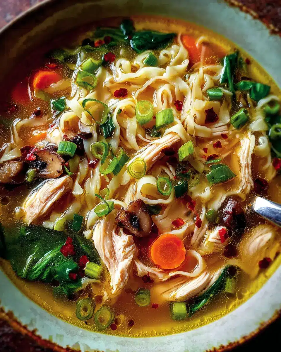 Absolutely! Ginger garlic chicken noodle soup is an excellent make-ahead meal. You can prepare the soup base, including the chicken and broth, a day in advance. Just store it in the fridge once cooled. When you’re ready to enjoy it, simply reheat the broth, add fresh noodles and vegetables, and cook until everything is warmed through.