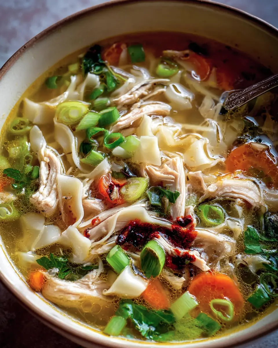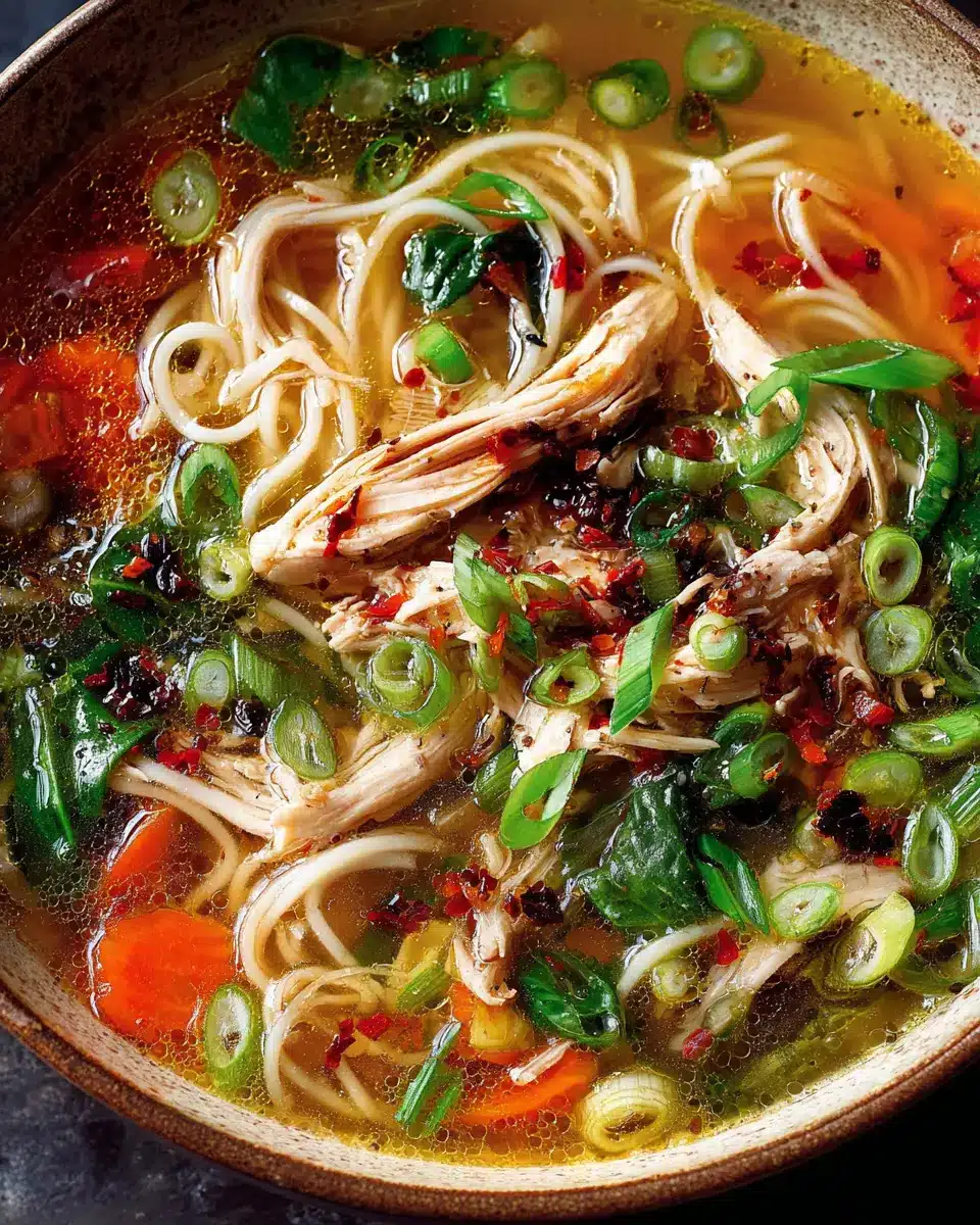 As your noodles reach the perfect texture, return the shredded chicken to the pot for a quick rewarm. This is where you can get creative with seasonings. Whisk together the black rice vinegar, soy sauce, and sesame oil in a bowl, then add crispy chili oil to taste. Once it’s all mixed, serve the soup hot, garnished with a handful of fresh scallion greens and a drizzle of that delightful soy sauce mixture.