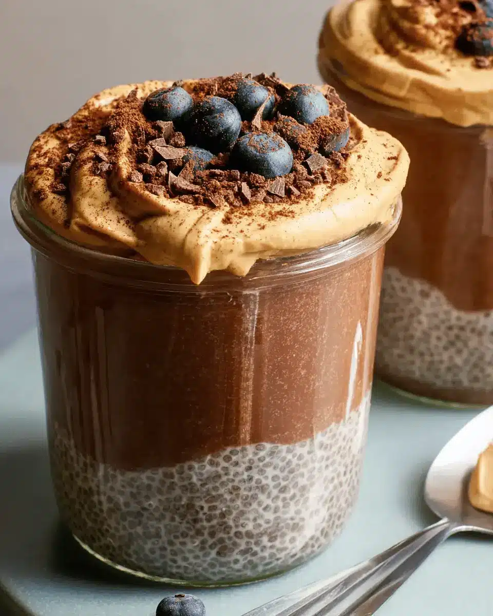 Before serving your delicious high-protein peanut butter pudding, give the peanut butter mixture a quick stir to ensure it's smooth. Spread about ¼ cup of the peanut butter layer over each chia layer. For an extra touch, dust some cocoa powder on top.