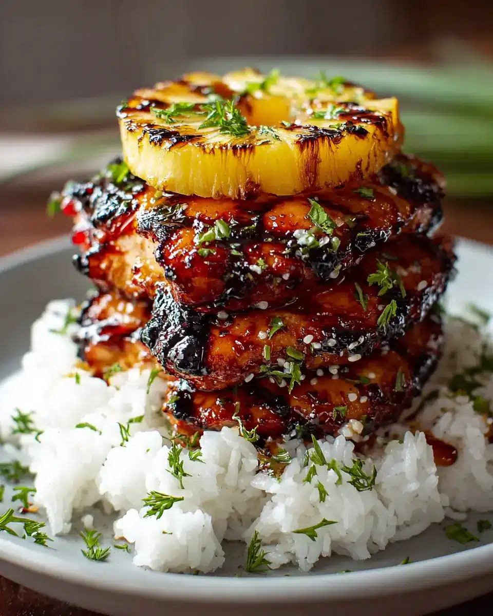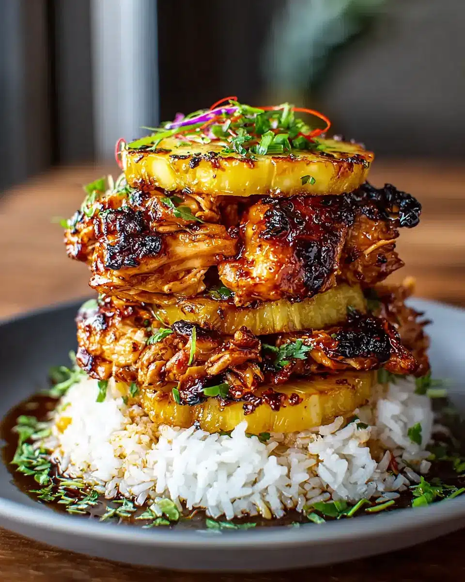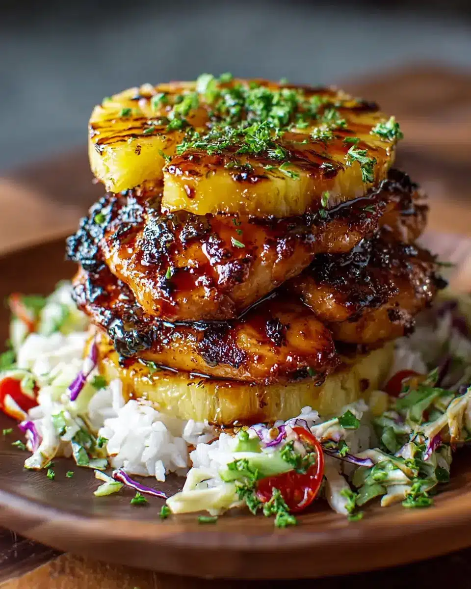 Make your stacks visually enticing! Use a round mold to form the rice layer perfectly, and angle the chicken for a tantalizing look. A drizzle of the sweet-savory glaze over the top will catch the light beautifully. Sprinkle with chopped green onions and toasted sesame seeds for an eye-catching finish. For additional color, serve extra grilled pineapple on the side, adding a burst of sweetness and vibrant tropical flair!
