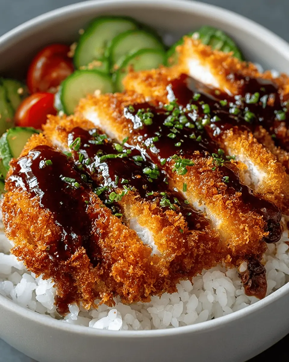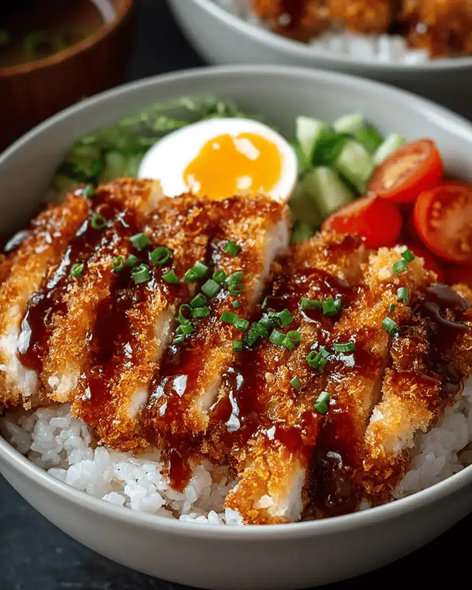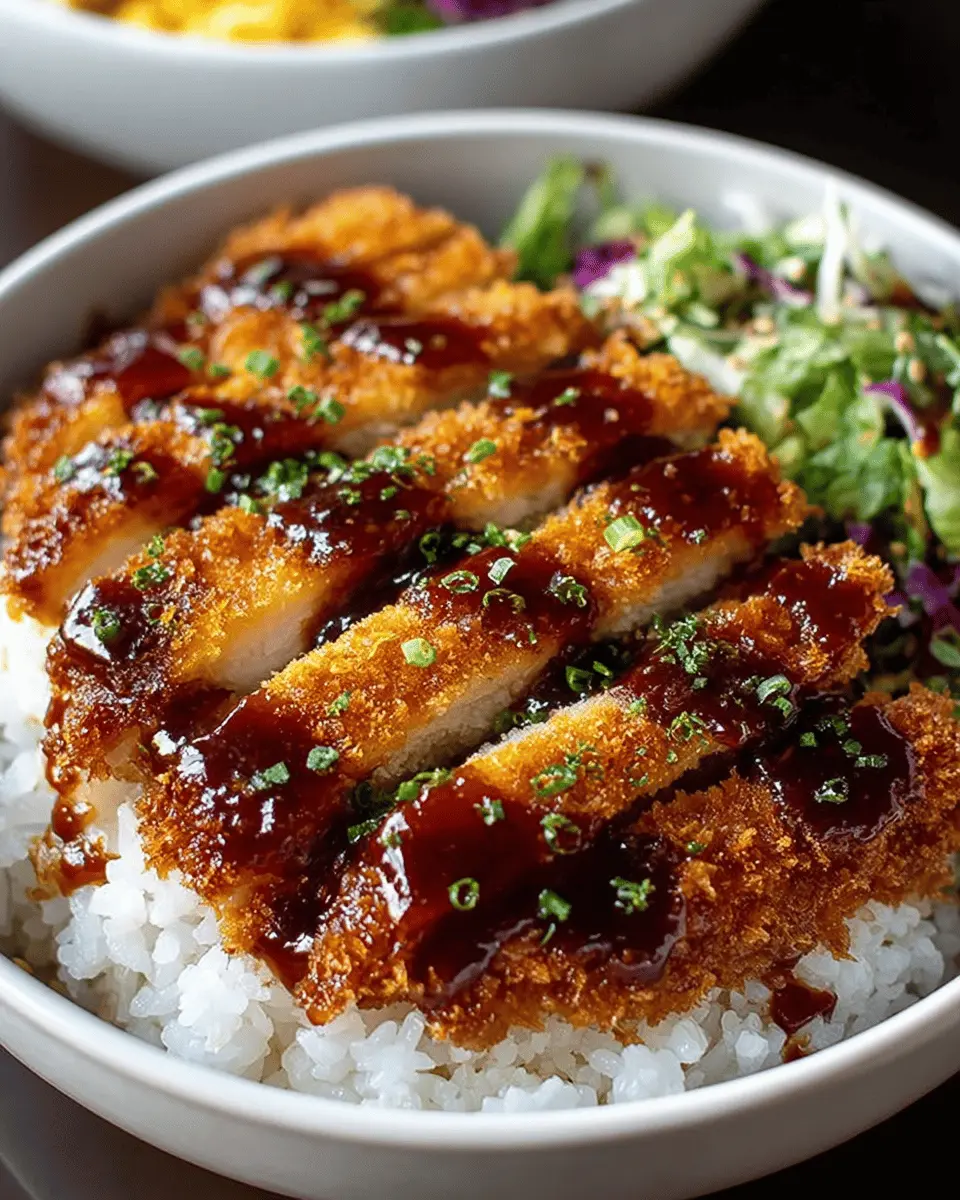 - Assemble the Bowls: Divide the rice between bowls, slice the katsu, and place it on top. Drizzle with tonkatsu sauce and Japanese mayo. Garnish with chopped parsley or green onions.