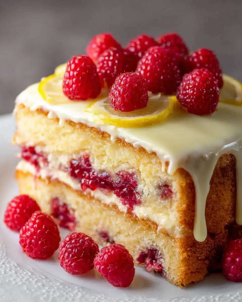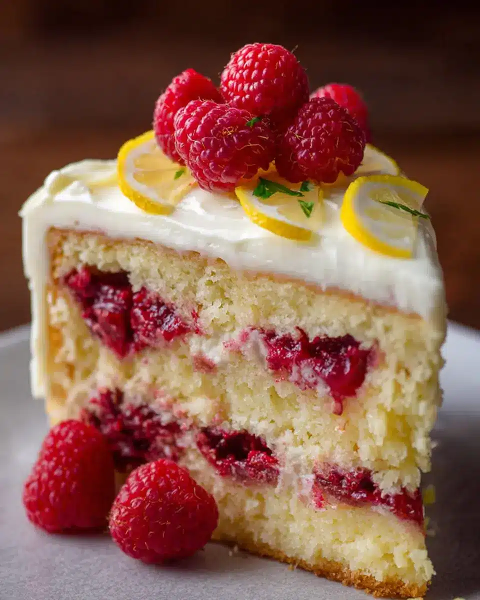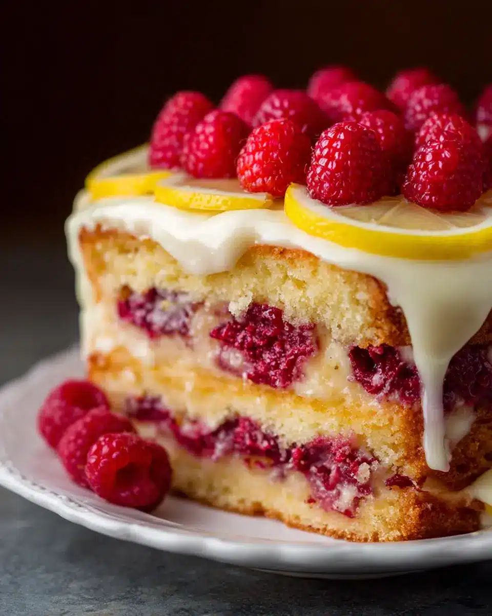 With approximately 28 grams of sugar per slice, this cake strikes a charming balance between sweetness from the raspberries and tanginess from the lemons.