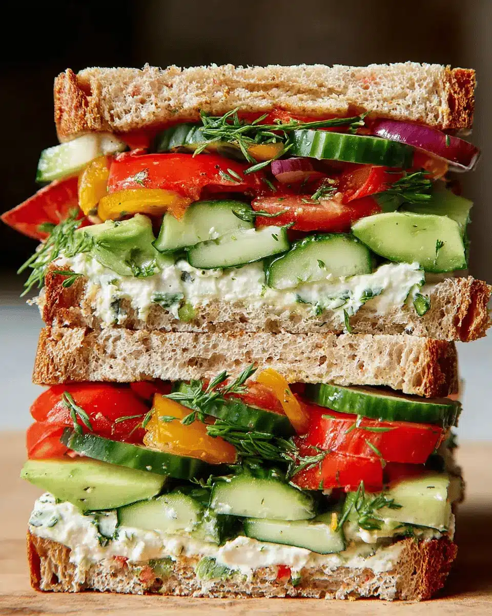 Imagine biting into perfectly toasted whole-grain bread, giving way to a creamy and zesty filling of ricotta and sharp cheddar cheese. Each layer brings freshness from crunchy cucumbers and vibrant red bell peppers. Plus, the addition of sliced avocado adds wholesome fats that keep you satisfied.