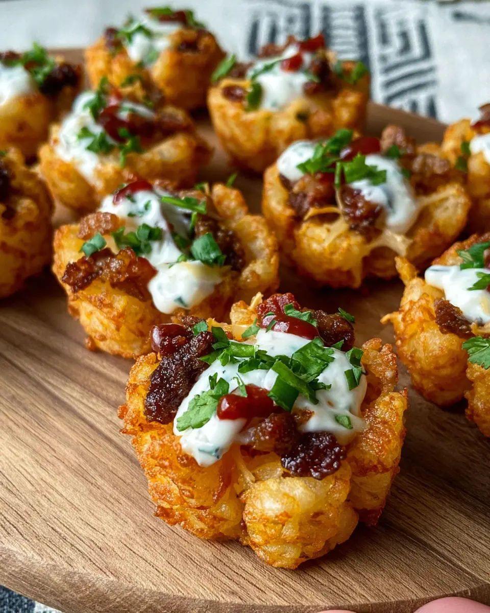 Absolutely! You can prepare the loaded tater tot cups and assemble them in advance. Just bake them until they are shaped, then let them cool completely. Cover with plastic wrap and store them in the refrigerator for up to 24 hours before the final bake. When you’re ready to serve, simply pop them back in the oven to reheat and melt the cheese.