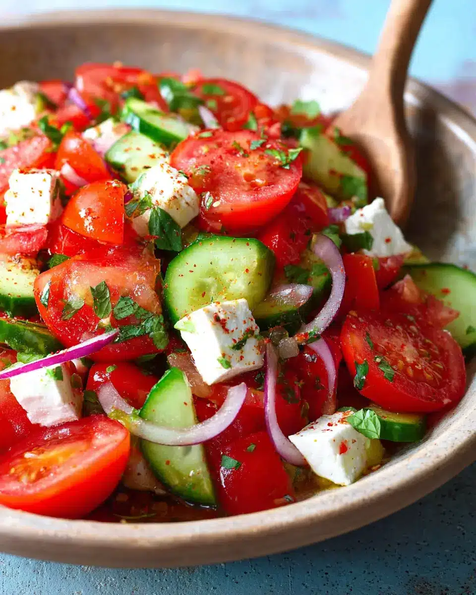 For the best experience with your Mediterranean Salad with Tomato and Cucumber, let it marinate for at least 5-10 minutes before serving. This allows the flavors to blend beautifully, enhancing the taste of the tomatoes and cucumbers. A sprinkle of salt during this time also helps draw out moisture, intensifying the natural flavors of the ingredients. Consider adding a pinch of oregano or chili flakes for an extra kick!
