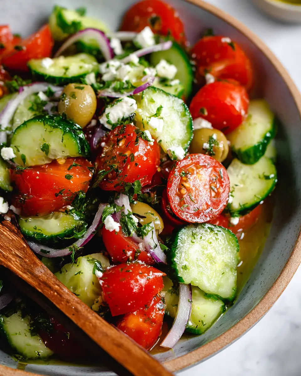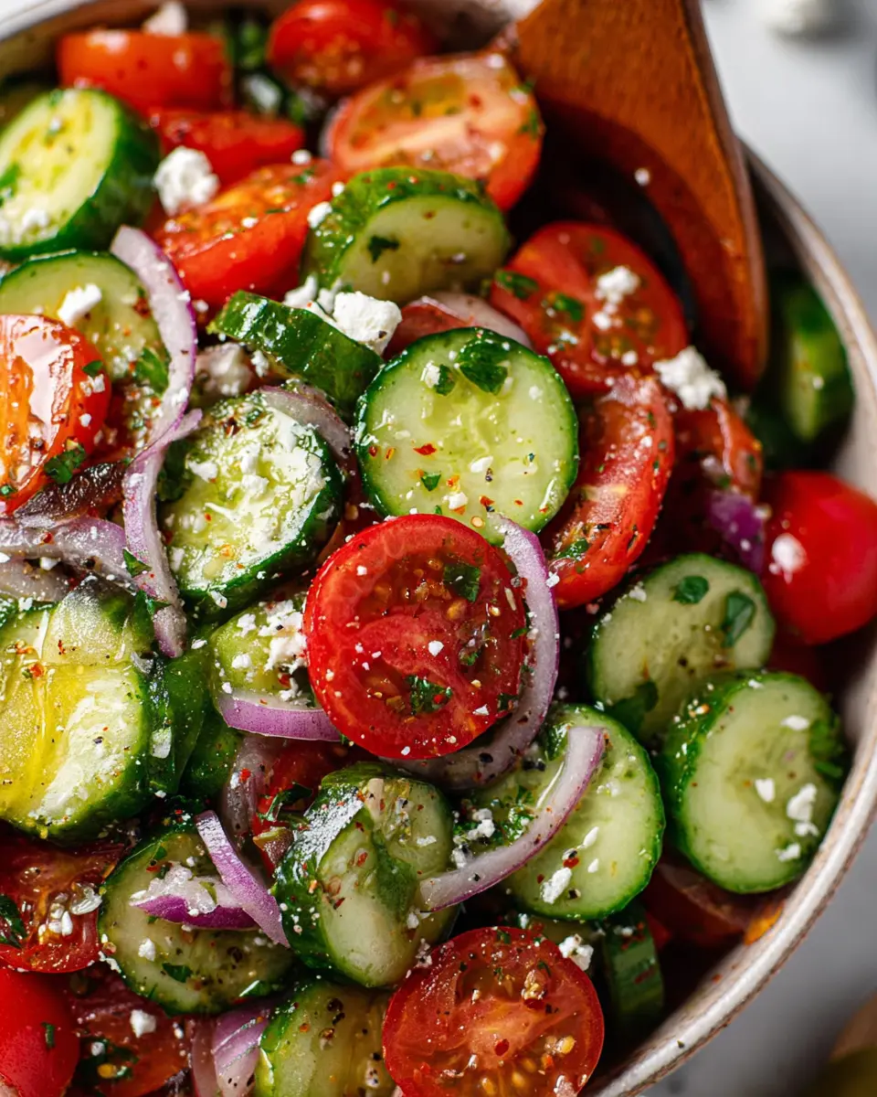 Your Mediterranean tomato and cucumber salad is now ready to shine at your dining table! Serve it immediately to enjoy the fresh flavors at their peak. This dish is perfect as a refreshing side or a light main course. Consider pairing it with grilled chicken or some tasty whole-grain pita for a well-rounded meal!