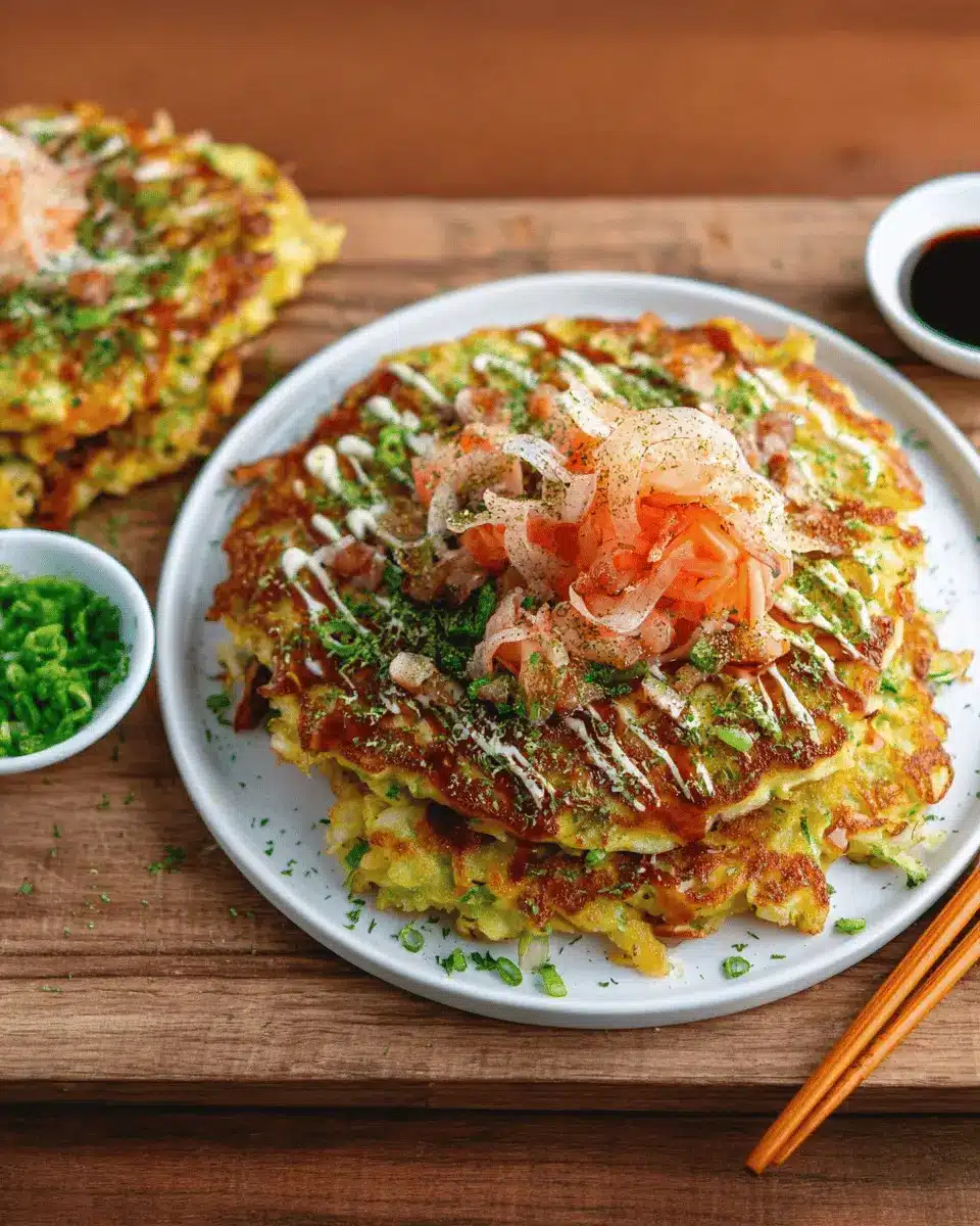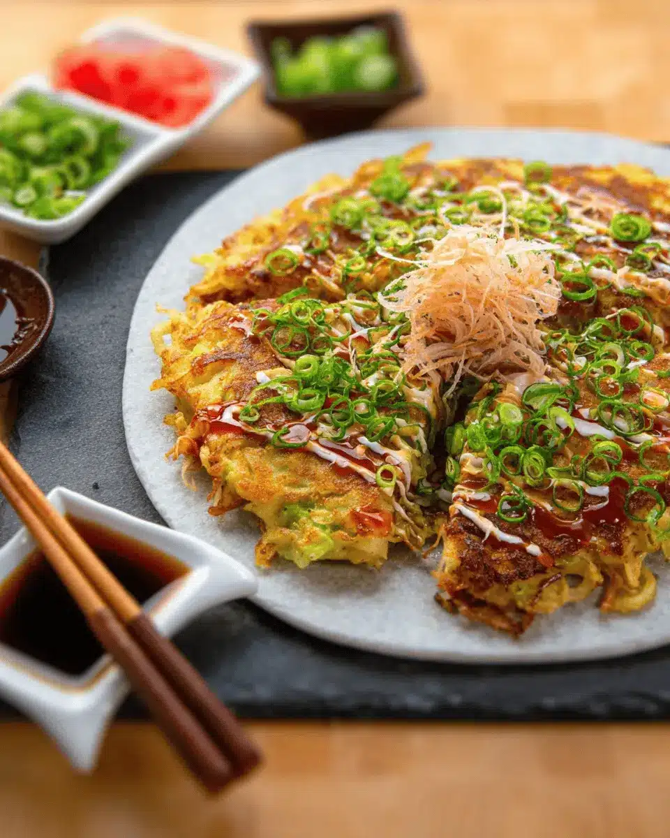 - Individual Servings: Cut the okonomiyaki into wedges and serve on small plates, garnished with bright green scallions and bonito flakes for an appetizing look.