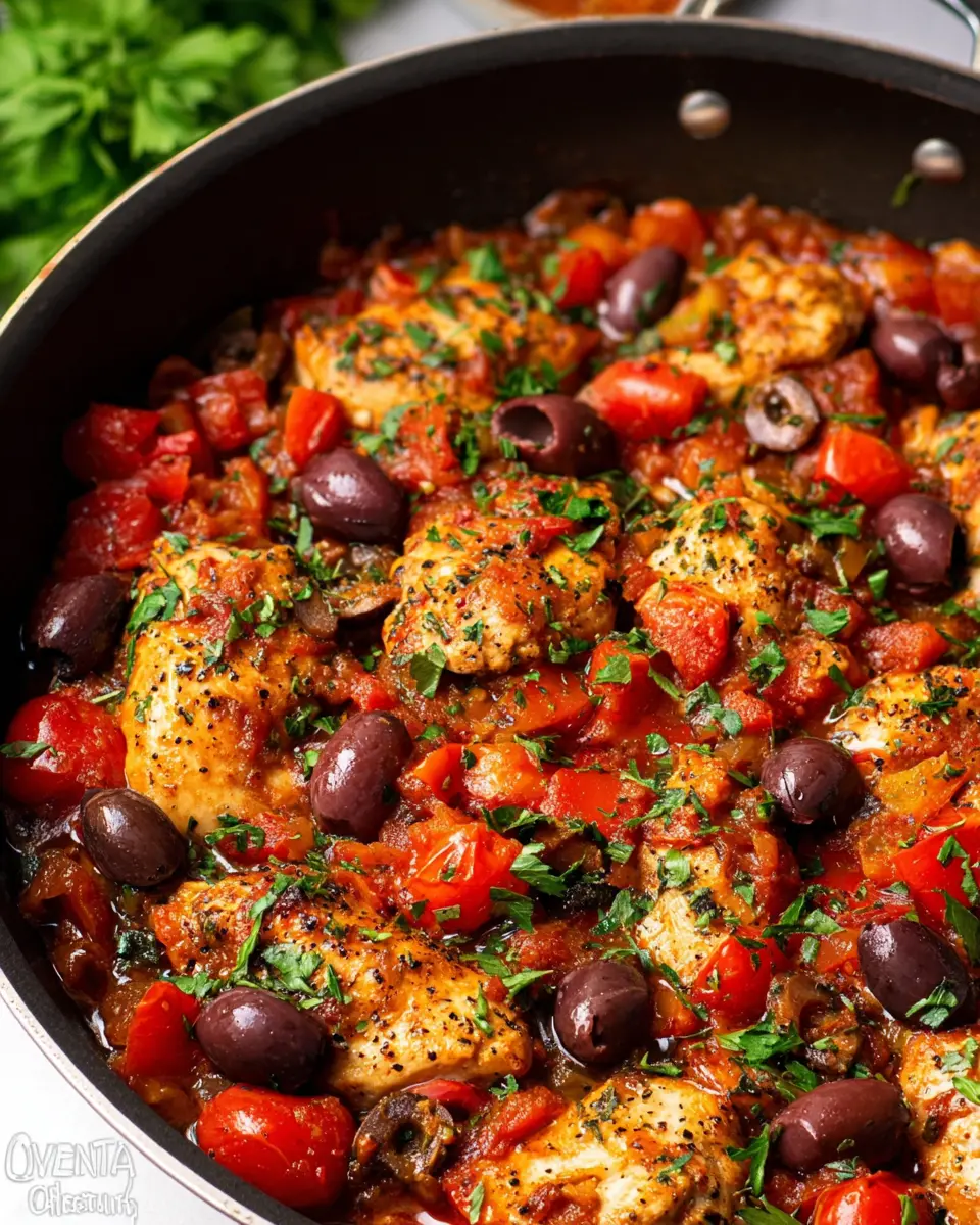 Next, it’s time to bring everything together. Stir in the canned diced tomatoes (including the liquid), sliced olives, and your fresh herbs. Allow this mixture to simmer for about 6–8 minutes, letting the flavors meld beautifully. This step creates a rich, savory sauce that your chicken will soak up when it’s added back in.