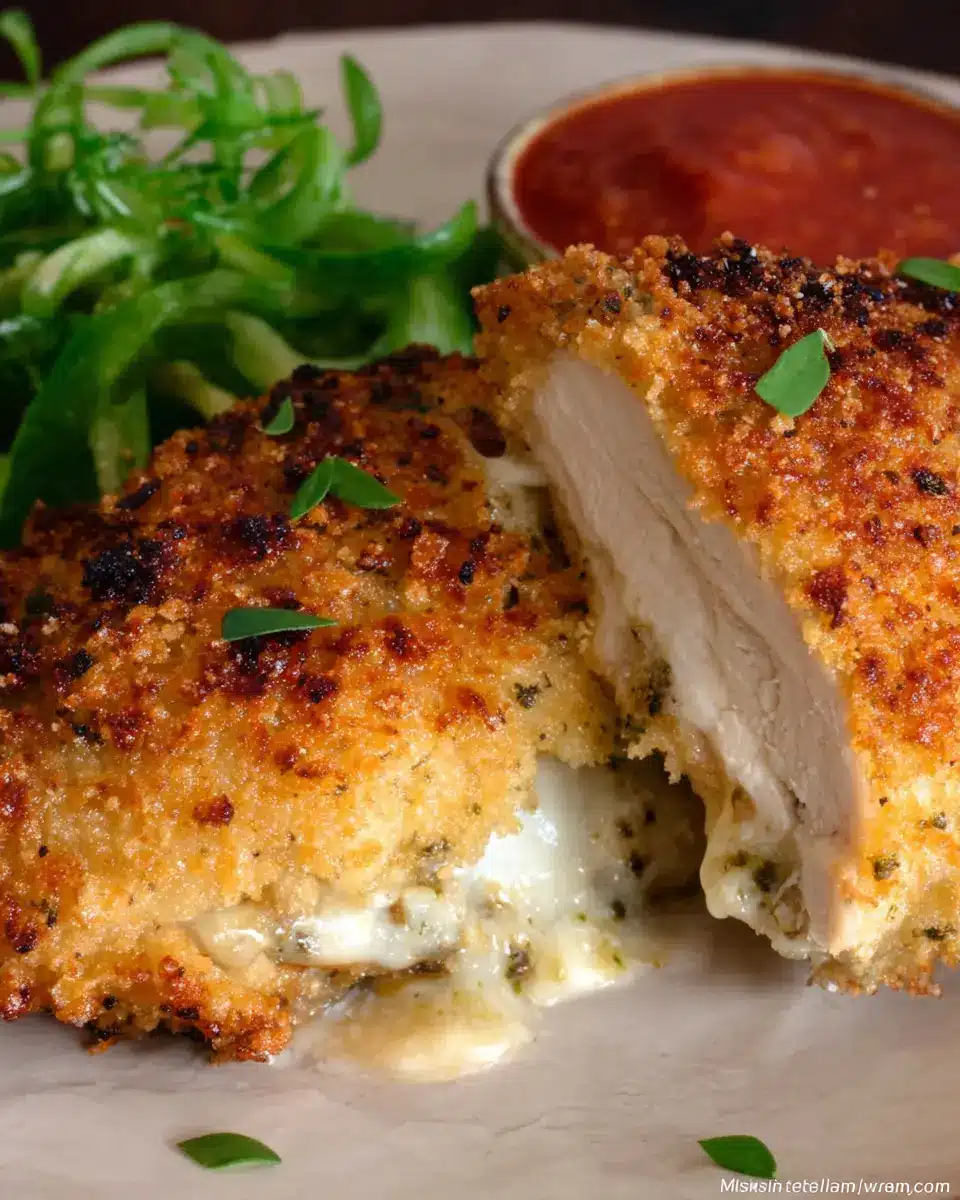 To complement your Oven Fried Provolone Stuffed Chicken Breasts, consider serving them alongside a crisp arugula salad tossed in balsamic vinaigrette for a refreshing contrast. Roasted vegetables, like zucchini and bell peppers, add vibrant color and a touch of sweetness. For a hearty side, garlic mashed potatoes or quinoa pilaf works wonderfully!