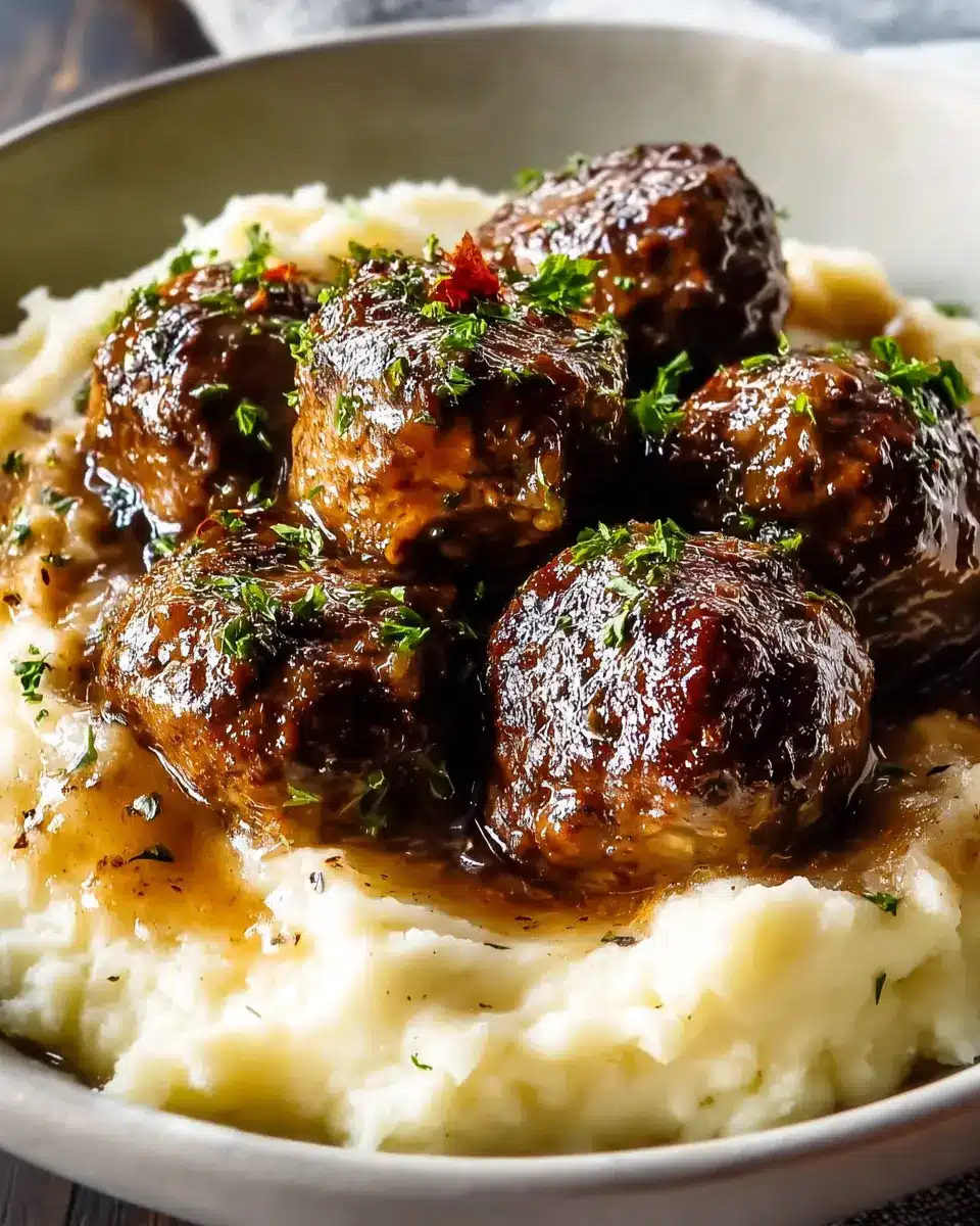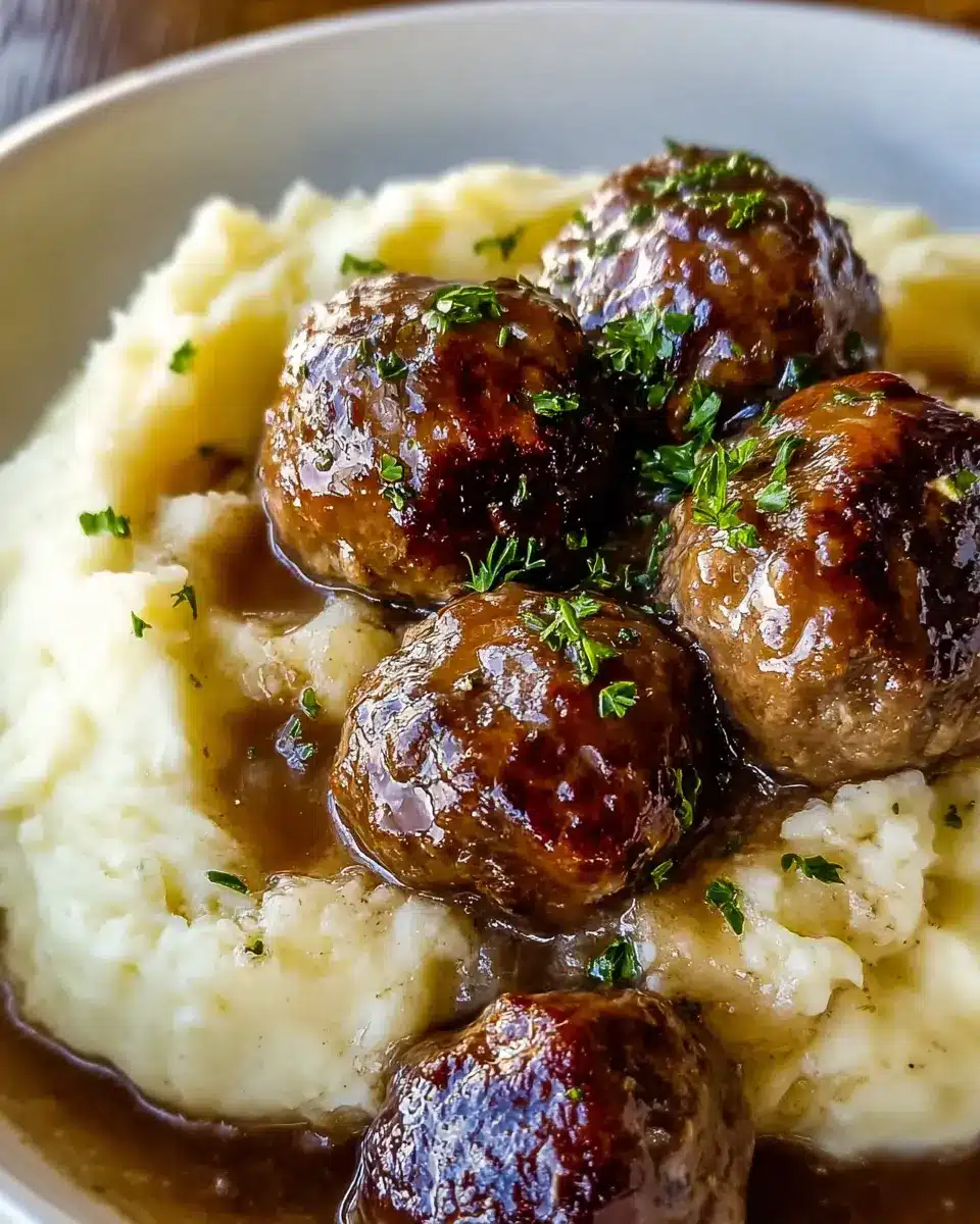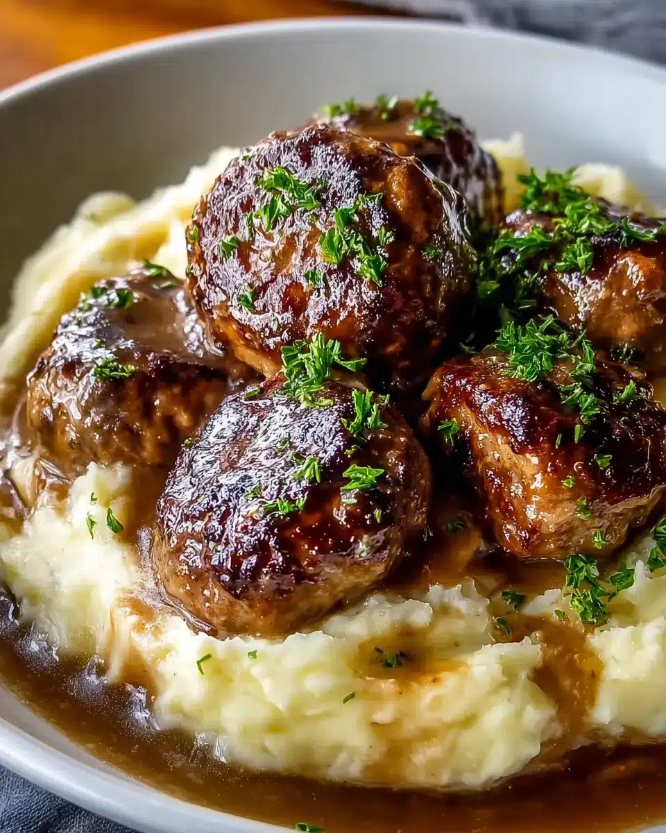 Salisbury Steak Meatballs & Garlic Herb Mashed Potatoes Recipe