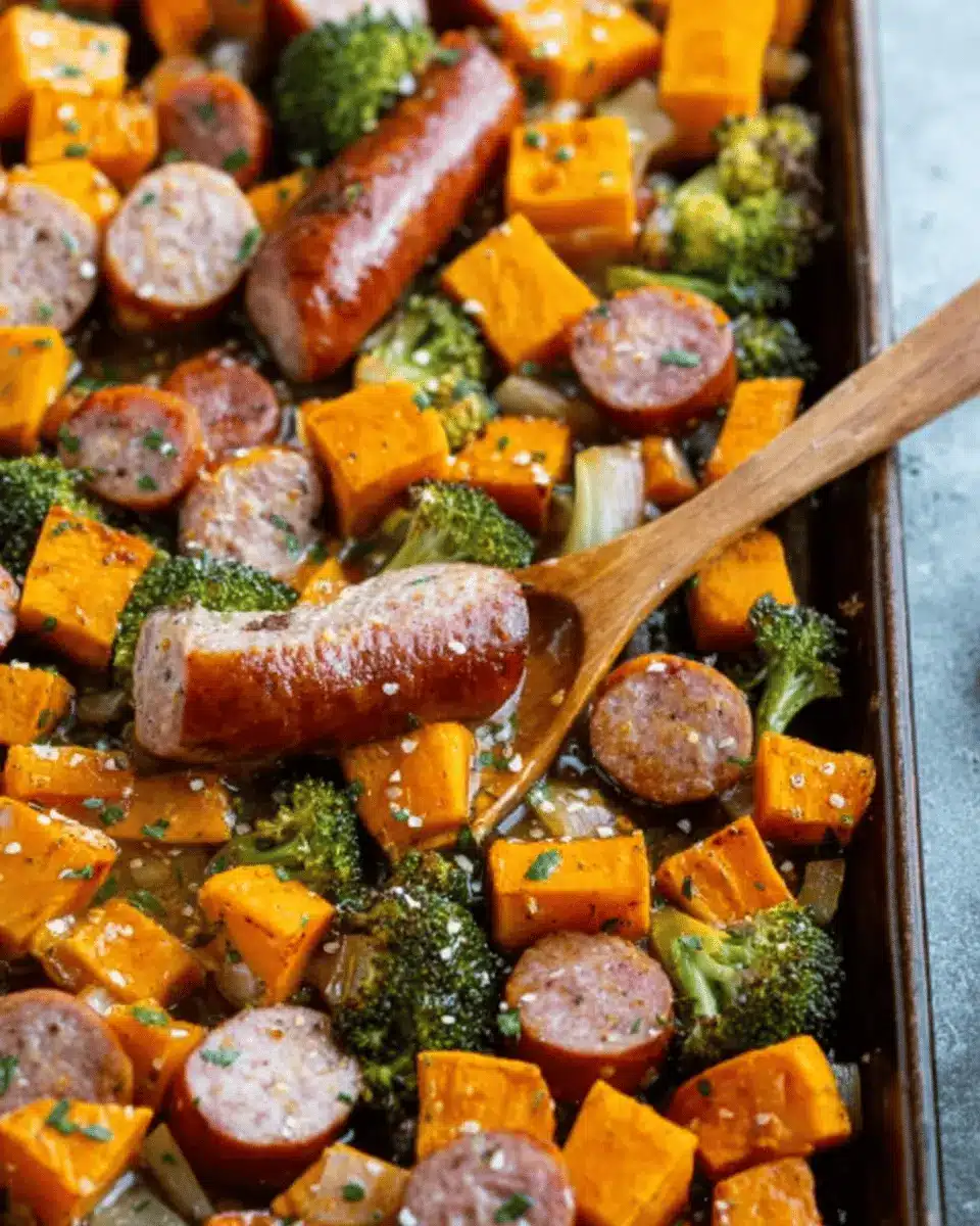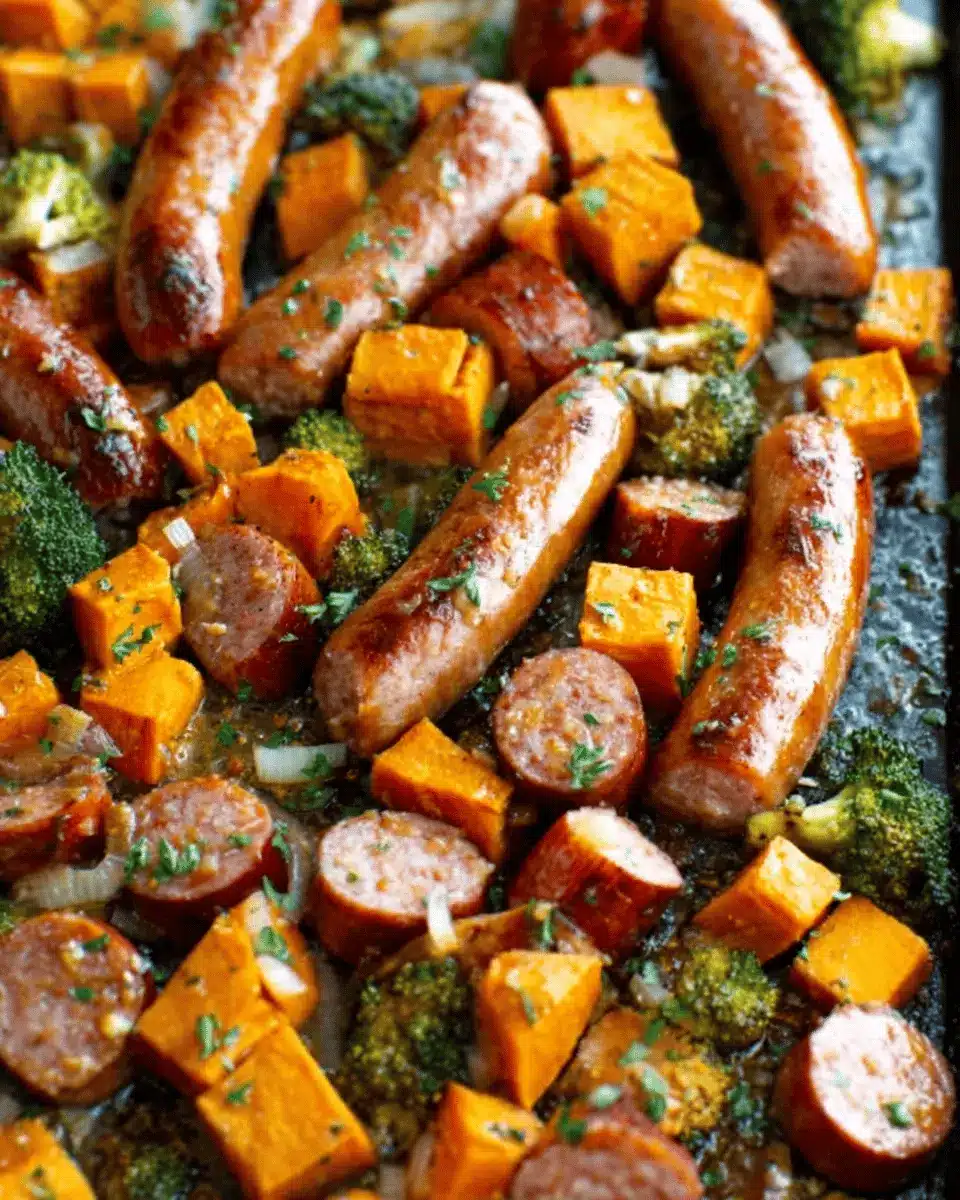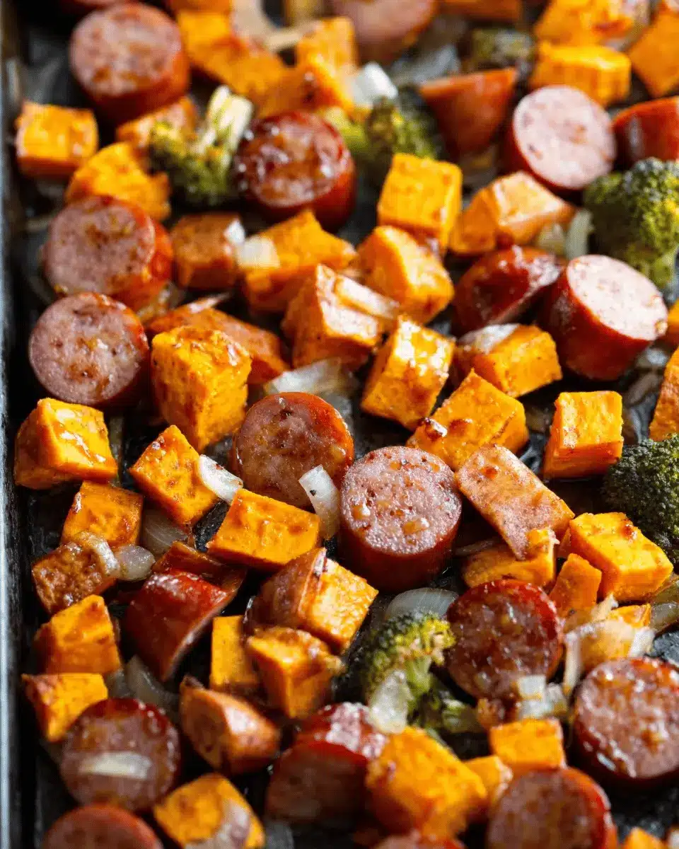 Once your sauce is ready, it’s time to put everything together. Drizzle the honey garlic sauce over the sausage slices, sweet potatoes, and broccoli. Make sure each piece is seasoned well with salt and pepper to taste. Toss everything gently—this is where you want to ensure all your ingredients are thoroughly coated in that luscious sauce. Arrange them in a single layer on the greased sheet pan to allow for even roasting.