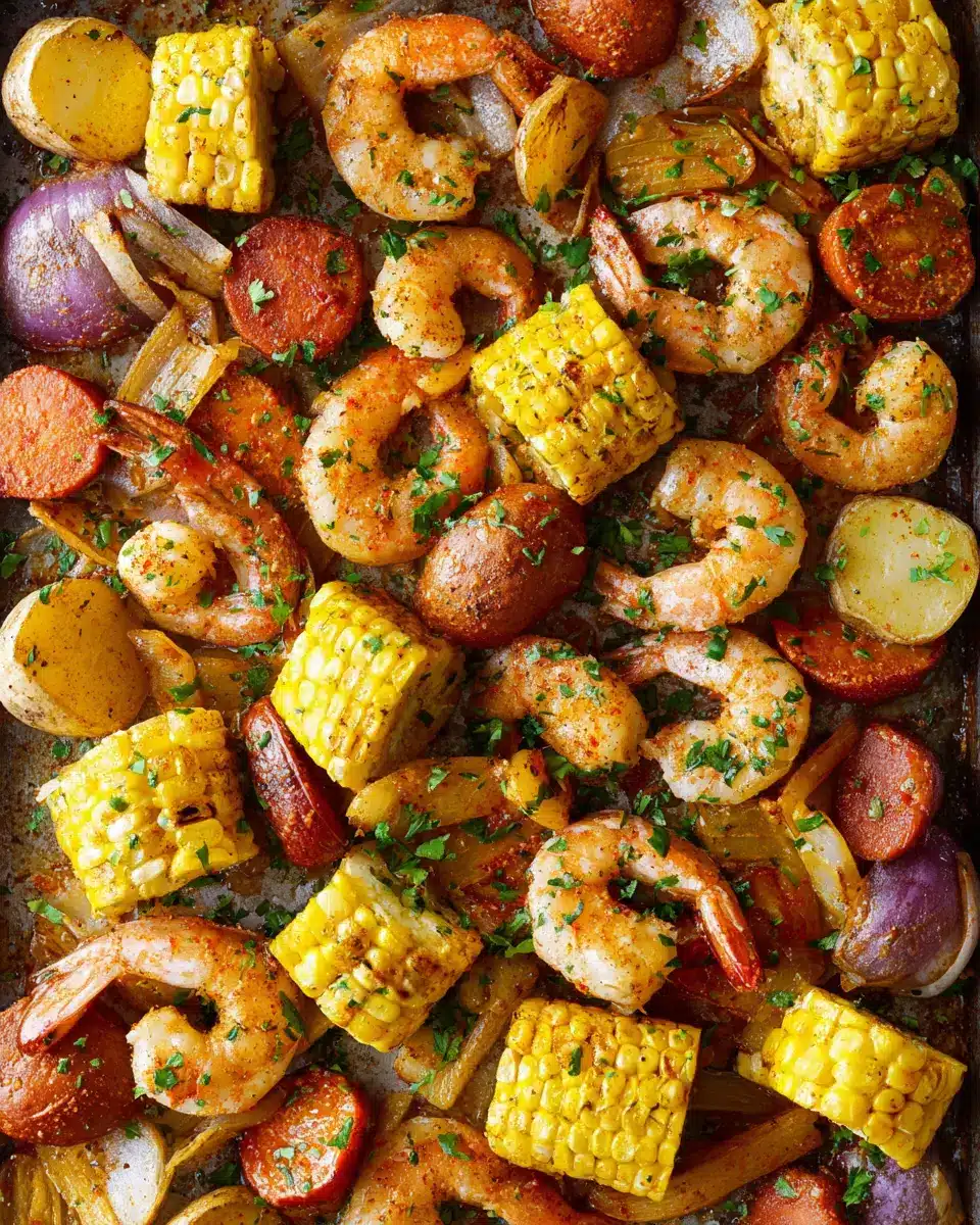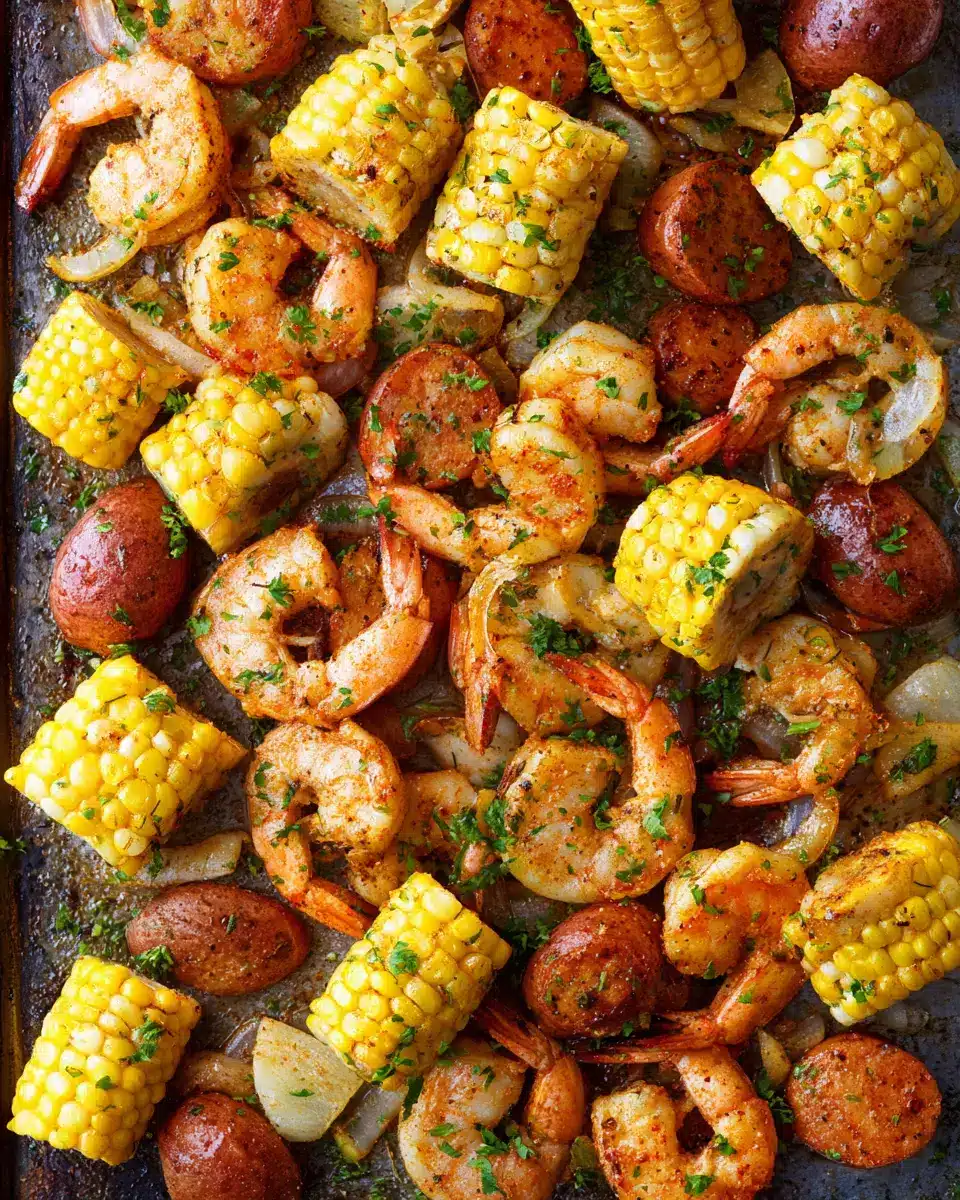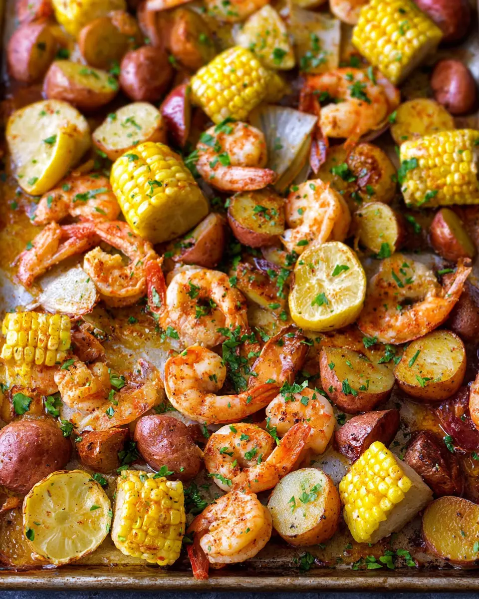 Place your beautifully assembled tray into the oven and bake for about 12-15 minutes. Keep an eye on the shrimp, which should turn opaque and pink—that’s when you know it’s perfectly done! The corn will be tender, and the sausage will bring everything together with its savory smokiness. Once you pull it out, serve the shrimp boil immediately with lemon wedges and a sprinkle of chopped parsley for a fresh finish.