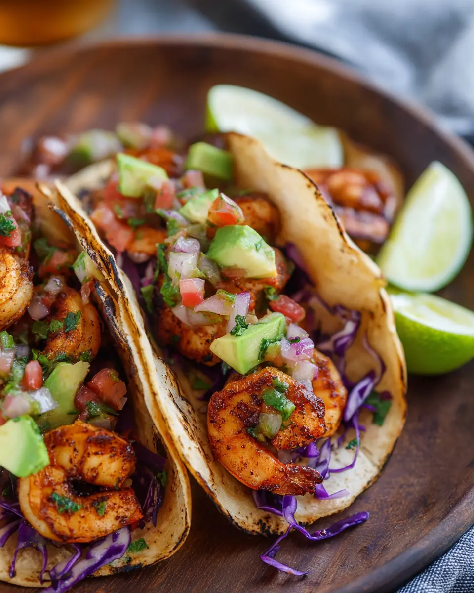Now for the fun part—assemble your shrimp tacos with avocado salsa! Place a spoonful of the fresh salsa in each tortilla, add three shrimp, and top with crunchy red cabbage. Serve with lime wedges and sour cream on the side so everyone can customize their own taco masterpiece.