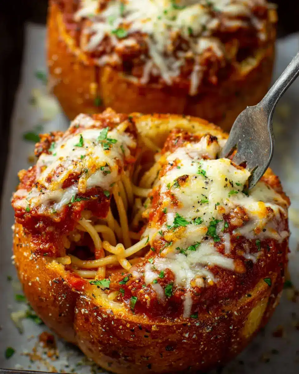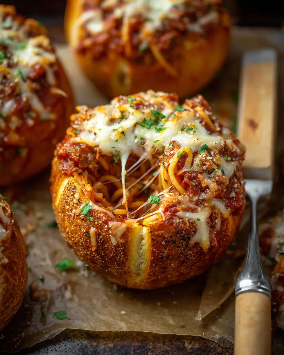 Once your spaghetti is ready, use tongs to transfer it directly into the meat sauce and toss away. Now, fill each prepared bread bowl with the spaghetti and top generously with shredded mozzarella. Pop those bowls into a preheated oven and let them bake until the bread is crusty and the cheese is gooey—this is where the real excitement begins. After about 8-10 minutes, garnish with extra parsley, and your feast is ready to be enjoyed!