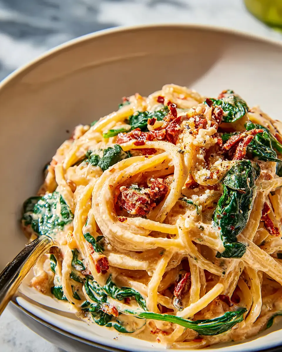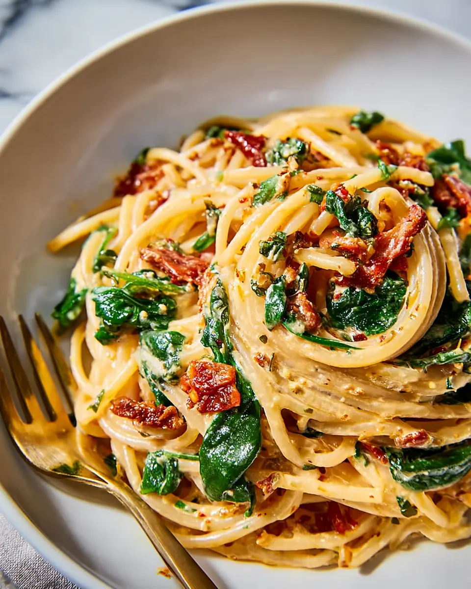 This delicious spaghetti spinach with sun-dried tomato cream sauce is not just a meal; it's a weeknight staple that combines flavor and nutrition effortlessly. With vibrant spinach and rich sun-dried tomatoes, it's a dish the entire family will love. Prepare to impress with this simple recipe!
