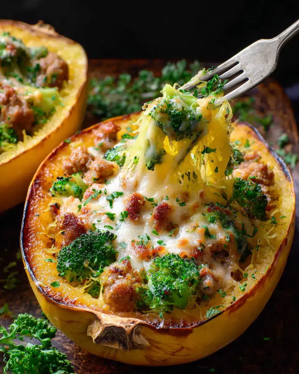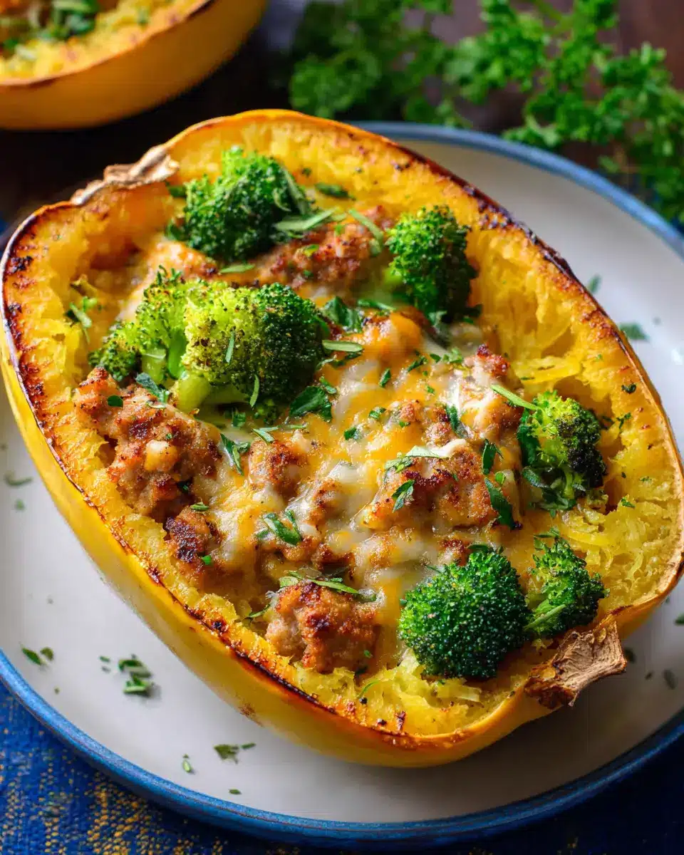 Stuffed Spaghetti Squash with Broccoli, Sausage, and Cheddar Cheese