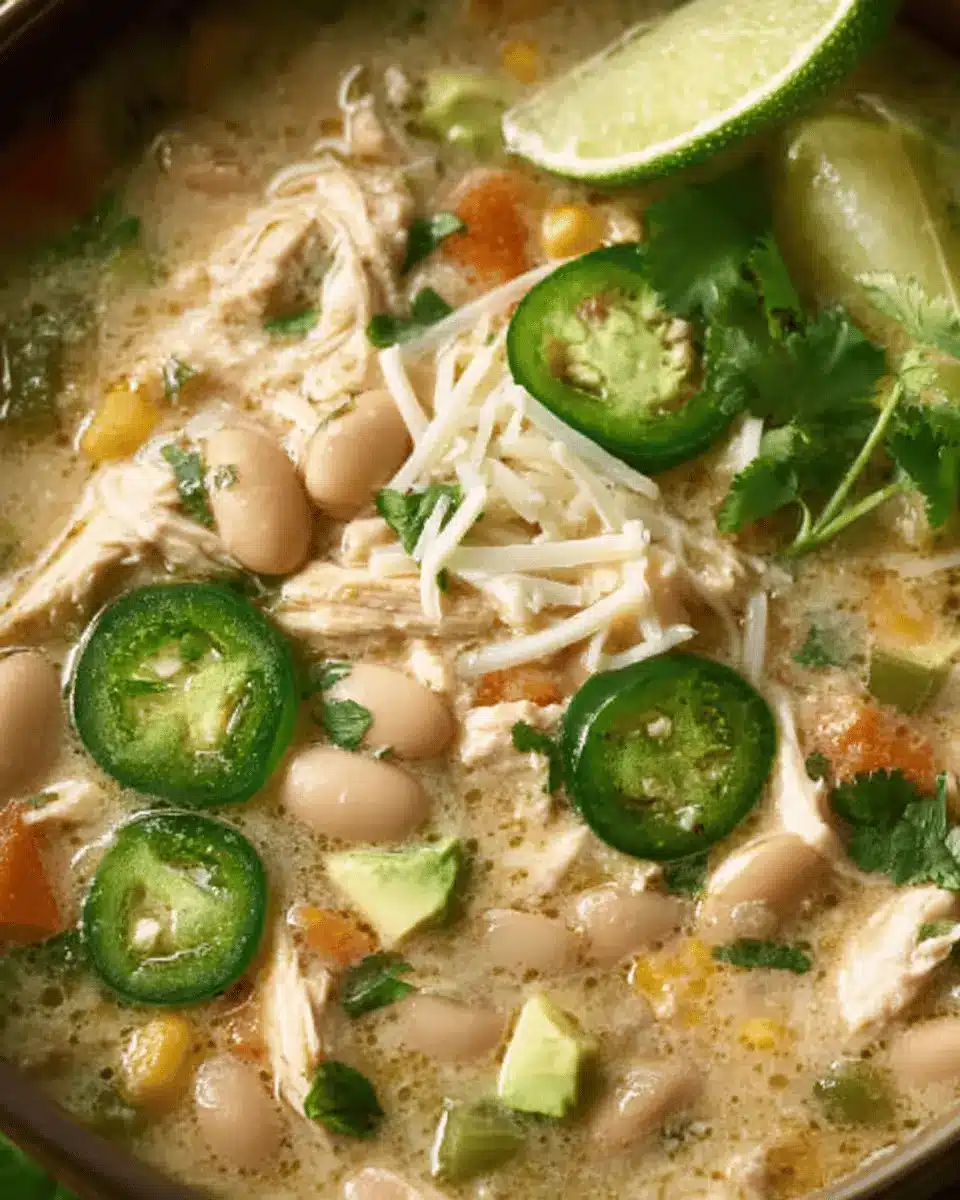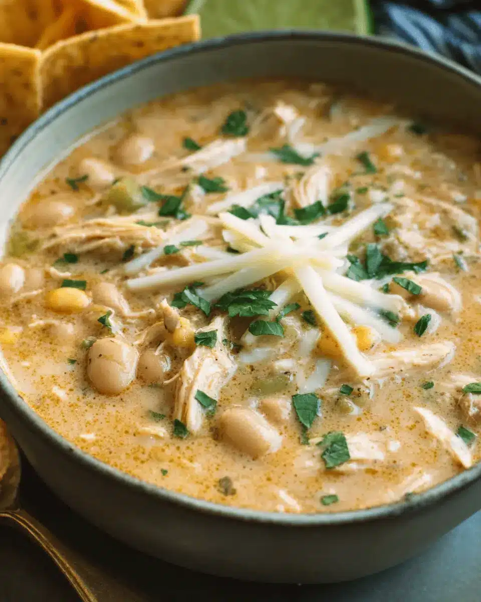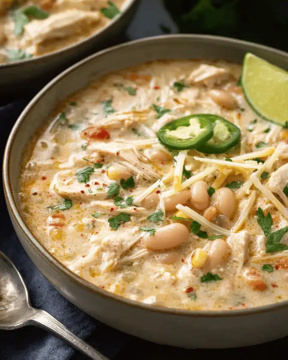 Finally, stir in your shredded chicken, fresh lime juice, and chopped cilantro to finish off the best white chicken chili ever! The lime juice gives a vibrant freshness that balances the dish beautifully. Garnish with Monterey Jack cheese, avocado, or tortilla chips for that extra flair. Serve it warm, and enjoy the cozy vibes that come with every spoonful.