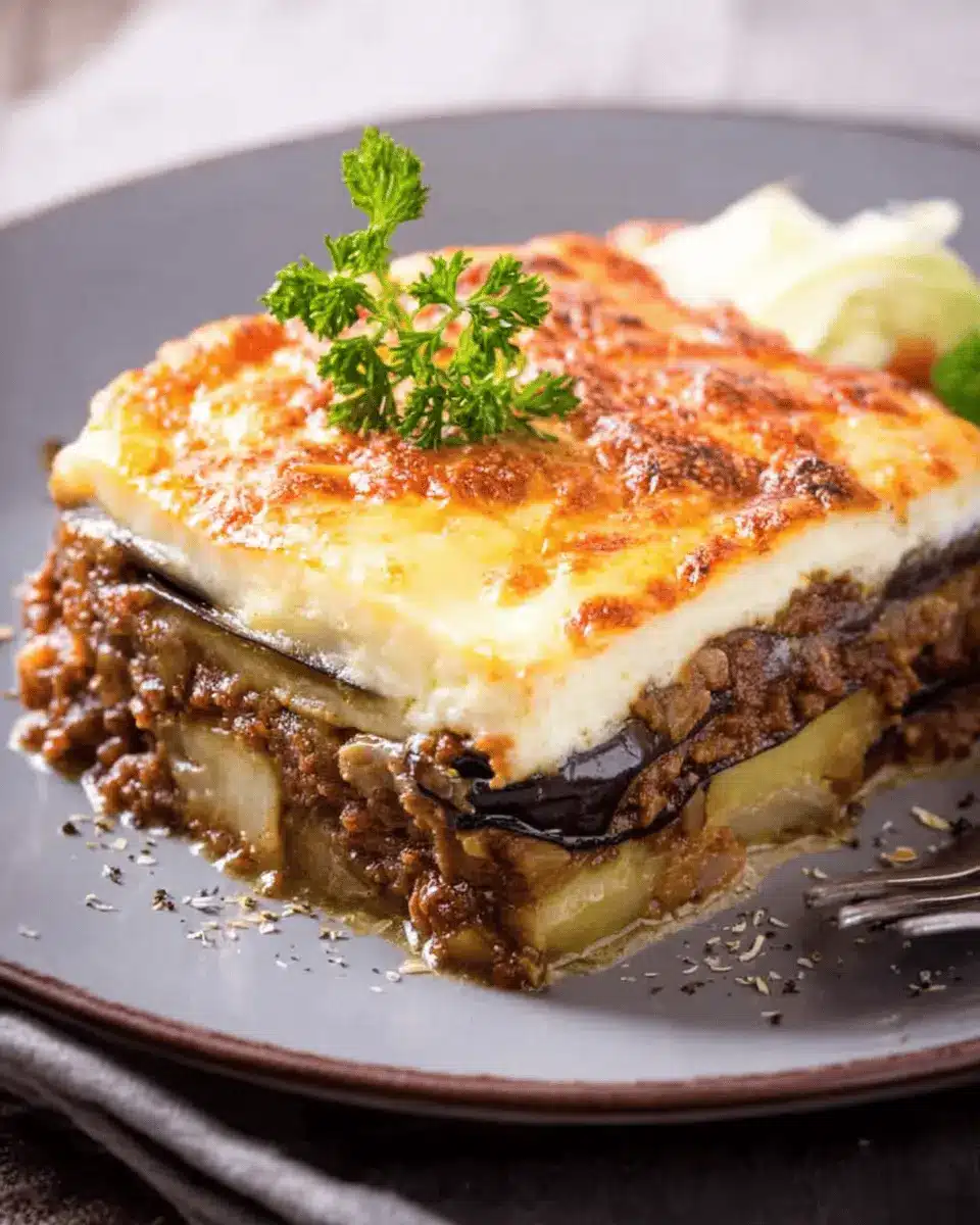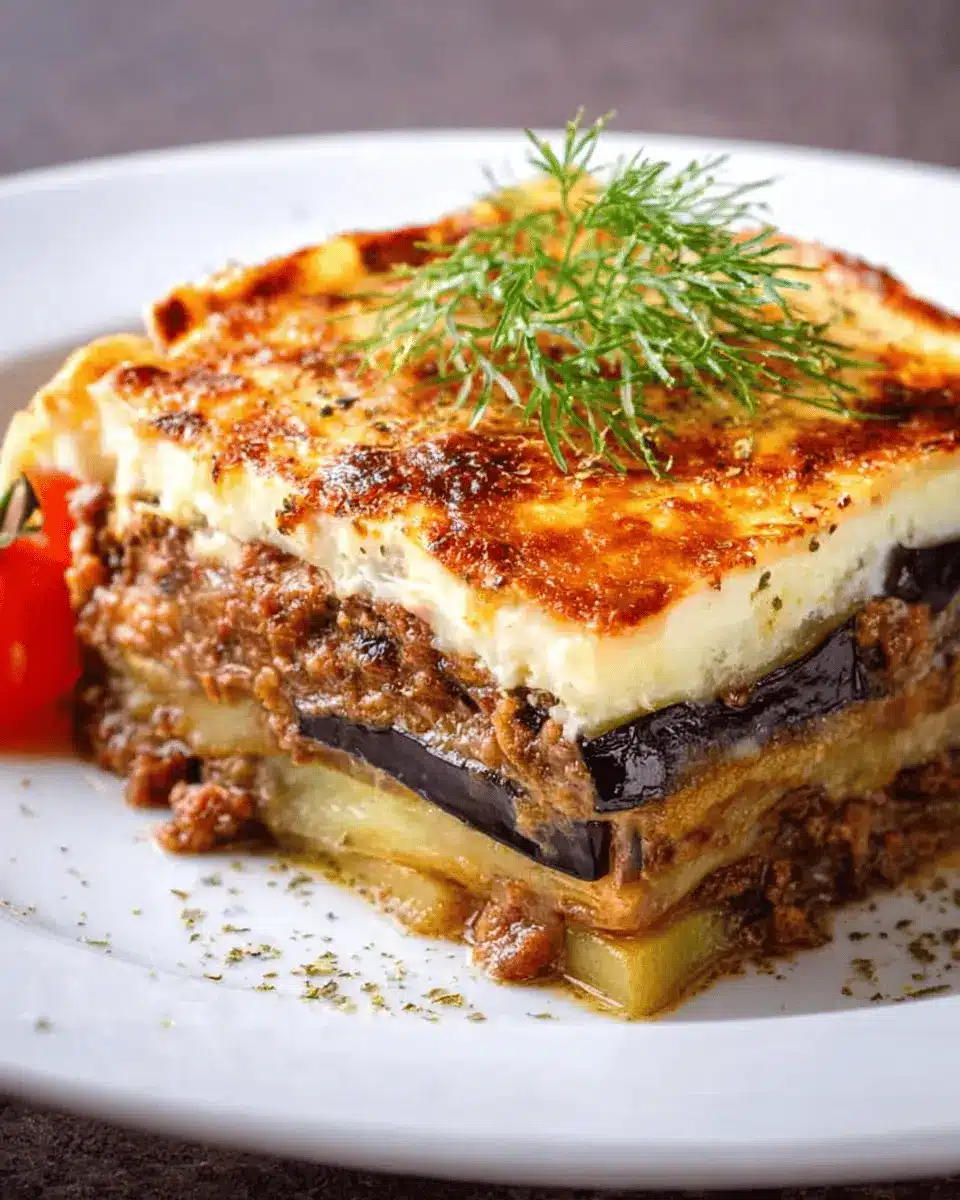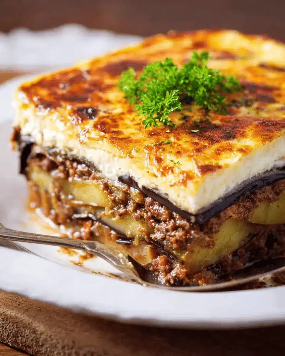 Traditional Moussaka recipe with eggplants (aubergines) and potatoes