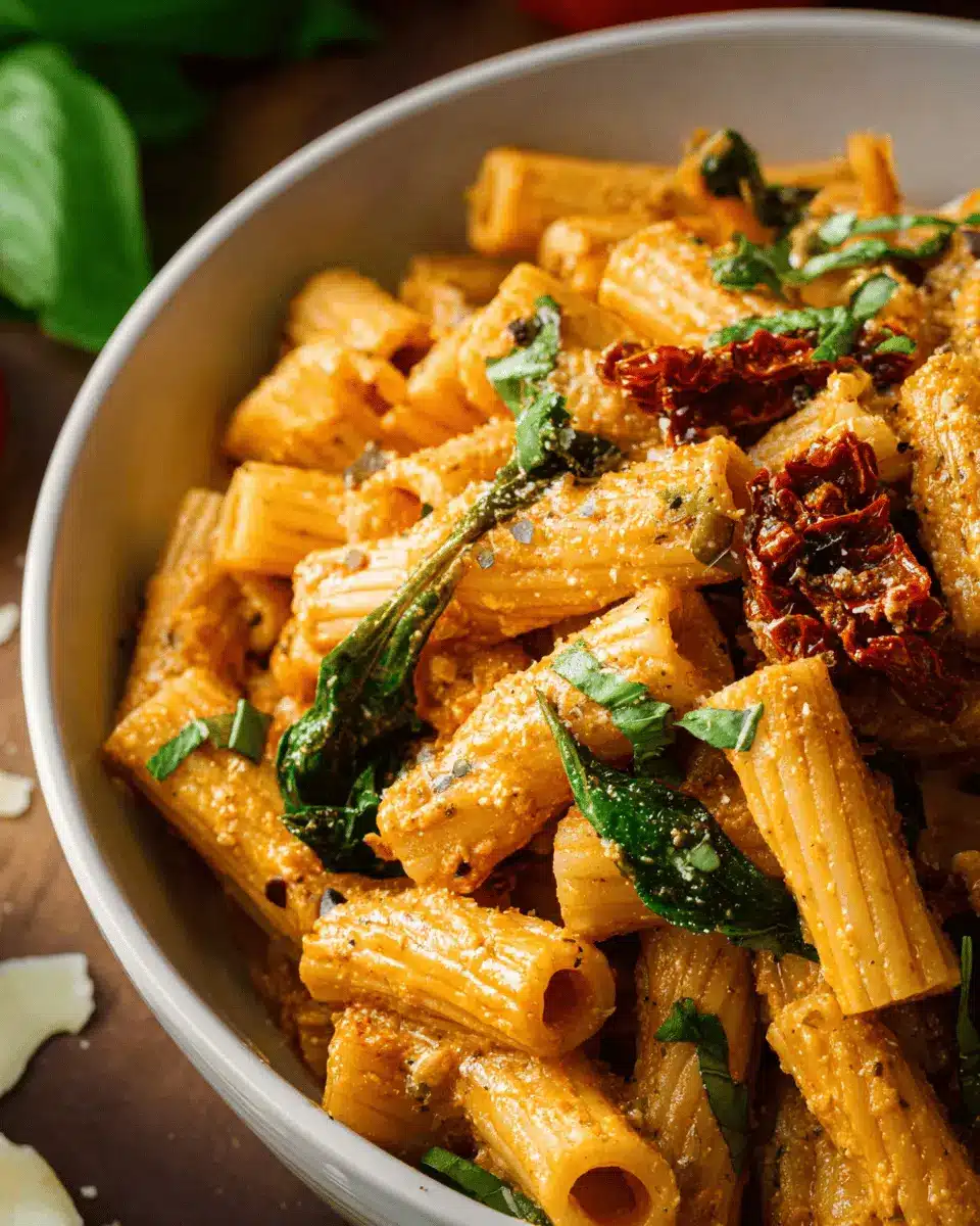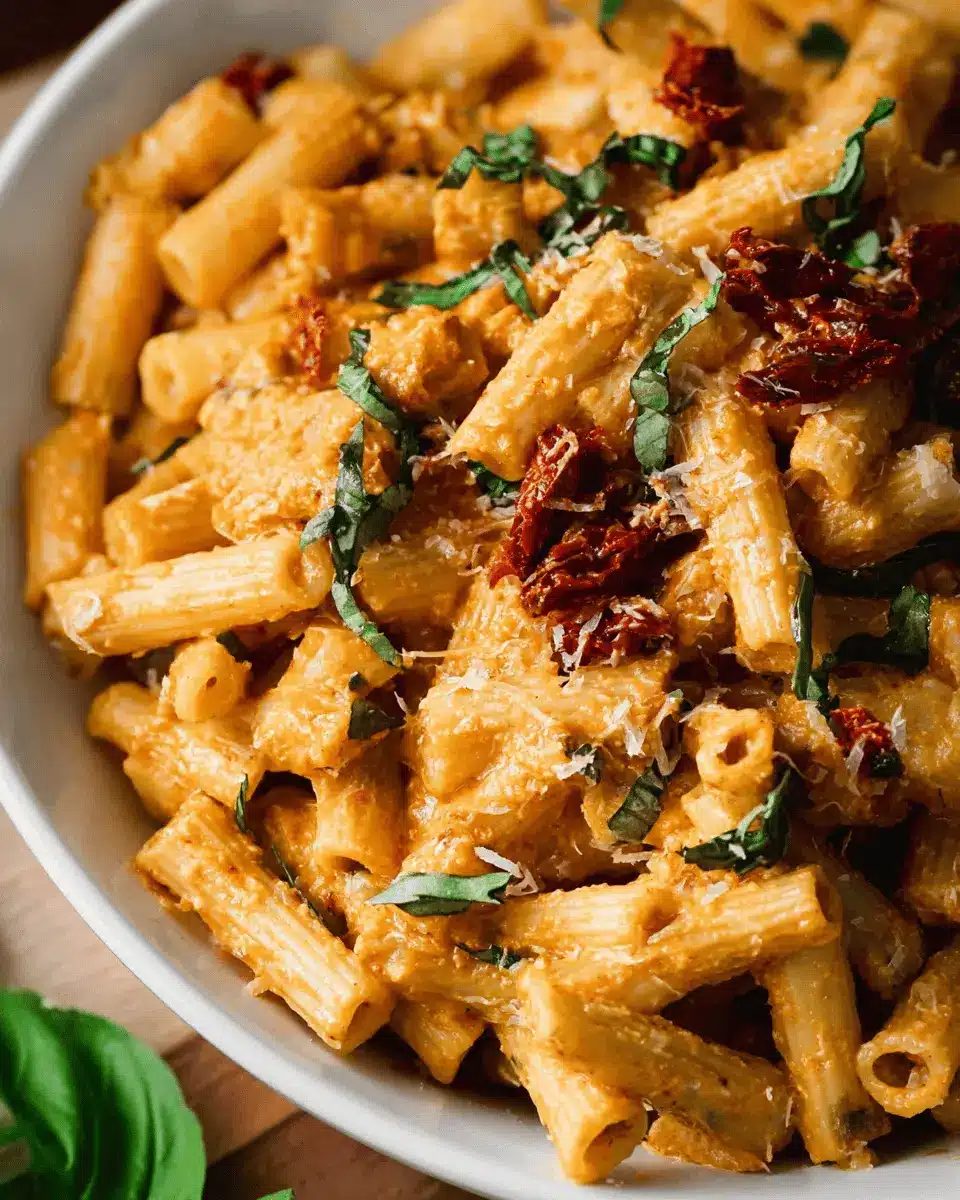 Make your vegan creamy sundried tomato pasta visually appealing by serving it in vibrant dishes. Use white plates to enhance the colors of the creamy sauce and fresh basil. For an added touch, consider garnishing with additional basil leaves and a sprinkle of vegan Parmesan. A light drizzle of high-quality olive oil can lend a gourmet flair. If you want to up the ante, you could even add a touch of red pepper flakes to showcase that hint of spiciness.